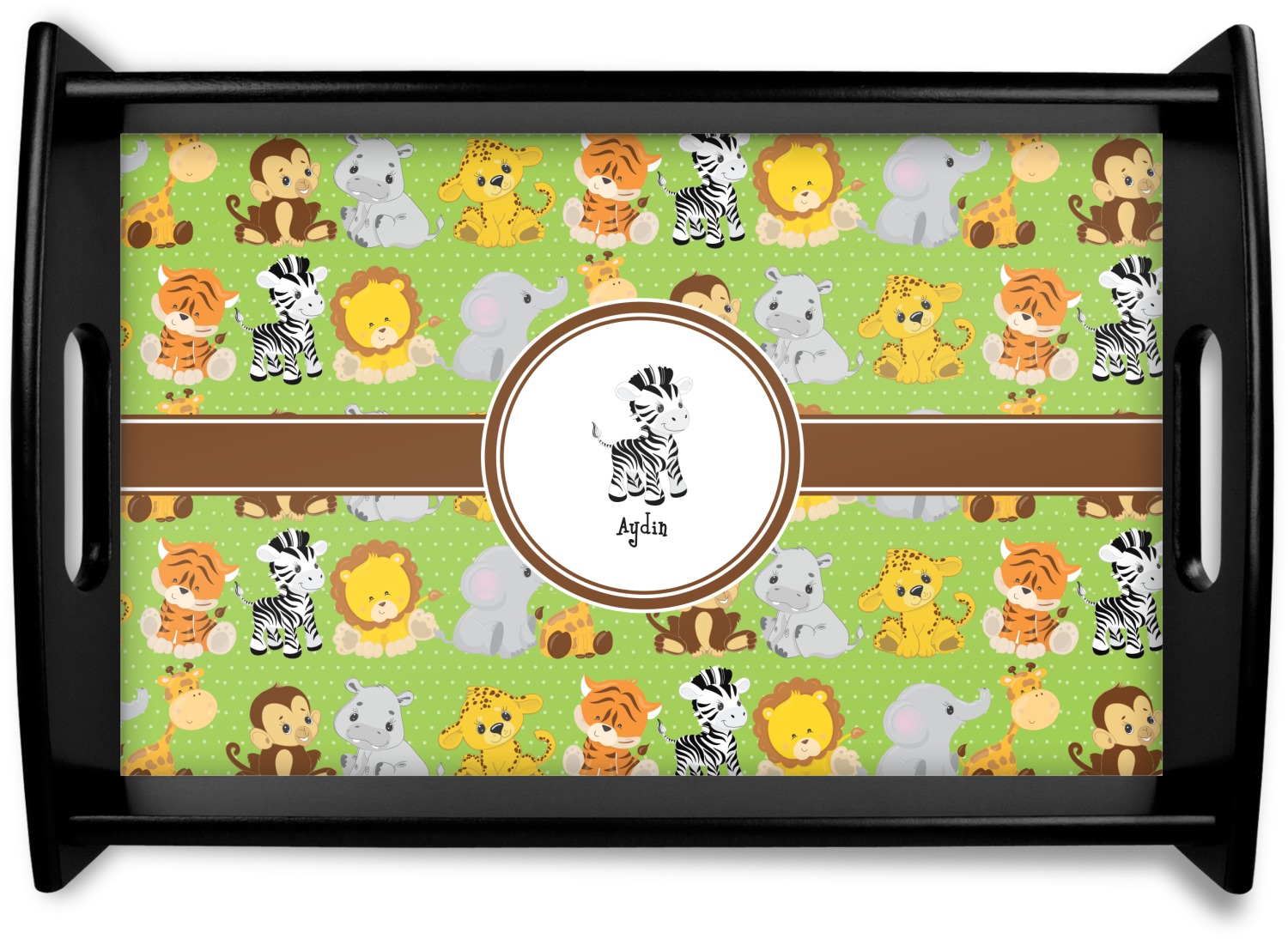 This serving tray with handles features square edges and two rounded sides, creating a very modern look. Each side is fabricated from a beautifully cut, natural wood. The bottom of the interior of the tray displays your customized design in bright, vibrant color. The tray is sold in both a black color and a natural wood look. Each variation of the wood serving tray has two sizes: Small, which is 14" x 10" x 2.25", and Large, which is 19.5" x 13.5" x 2.75".