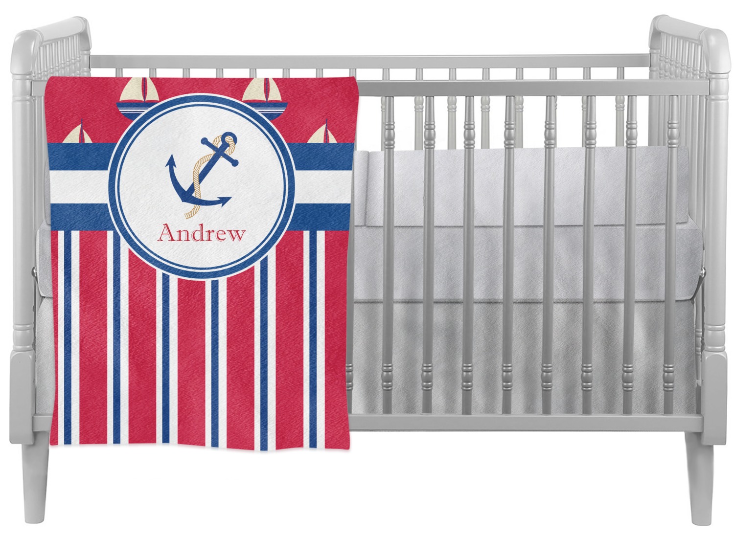 A porthole circle showcases an anchor and rope in the coordinating colors. Add your child's name for that personalized designer's touch.