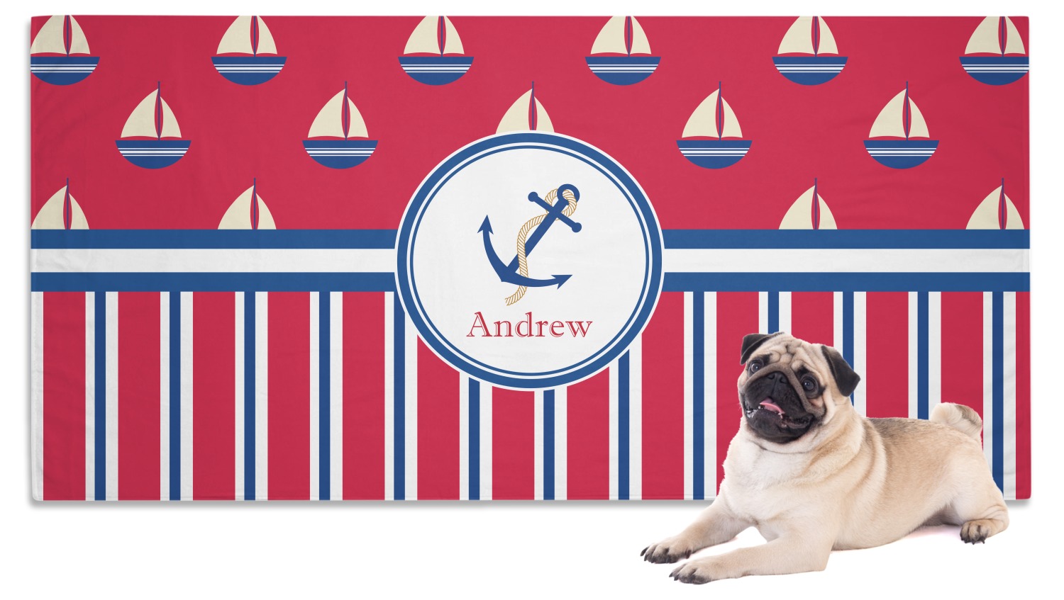 Our custom towels are crafted from a special blend of polyester and polyamide, which contributes to its lightweight, yet thoroughly absorbent nature. We craft it as such to guarantee efficiency as a convenient product; its lightweight nature makes it easy to roll up and carry along, yet it is still able to dry off even the wettest, muddiest pet. It measures at 60" x 30" and is sizable enough to dry off even the largest of pets. With our towel's gentle, soft-to-the-touch material, your pet will be sure to anticipate its warm, dry embrace. We print your personalized design on the front of the towel, while the back is white.