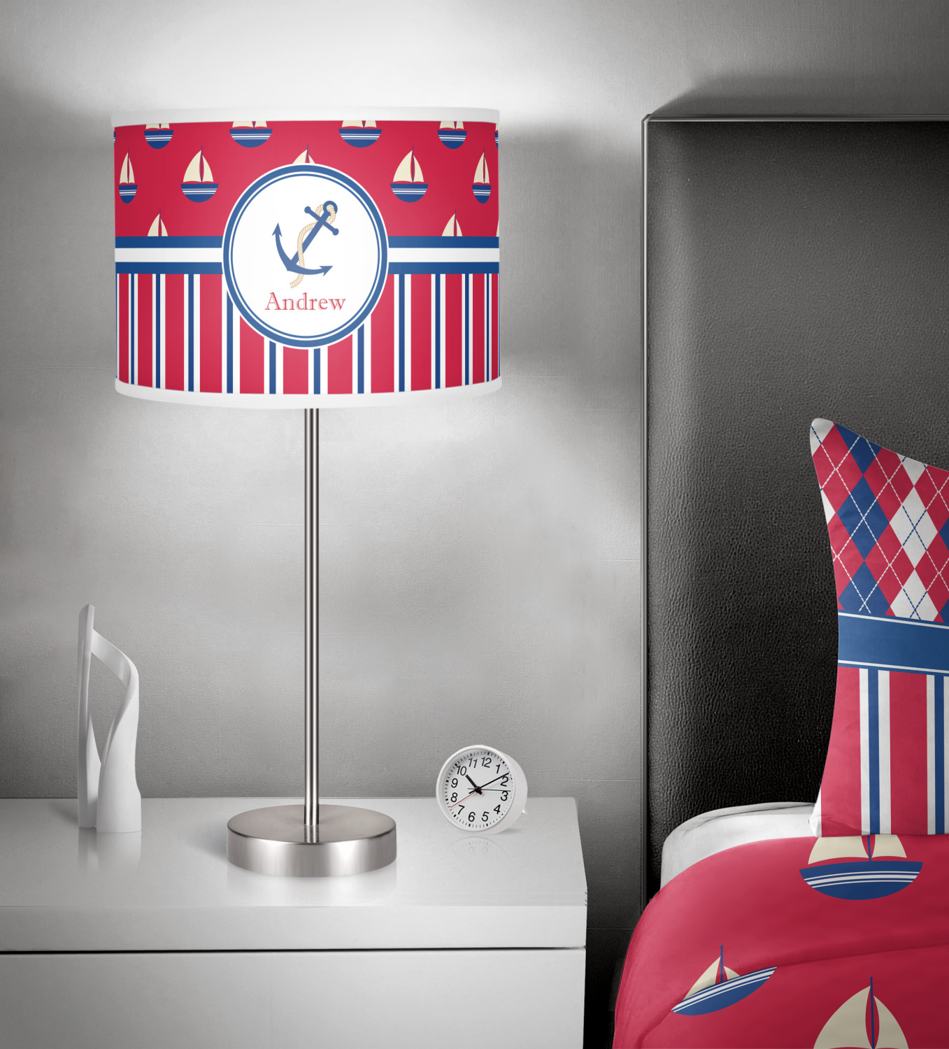 A porthole circle showcases an anchor and rope in the coordinating colors. Add your child's name for that personalized designer's touch.