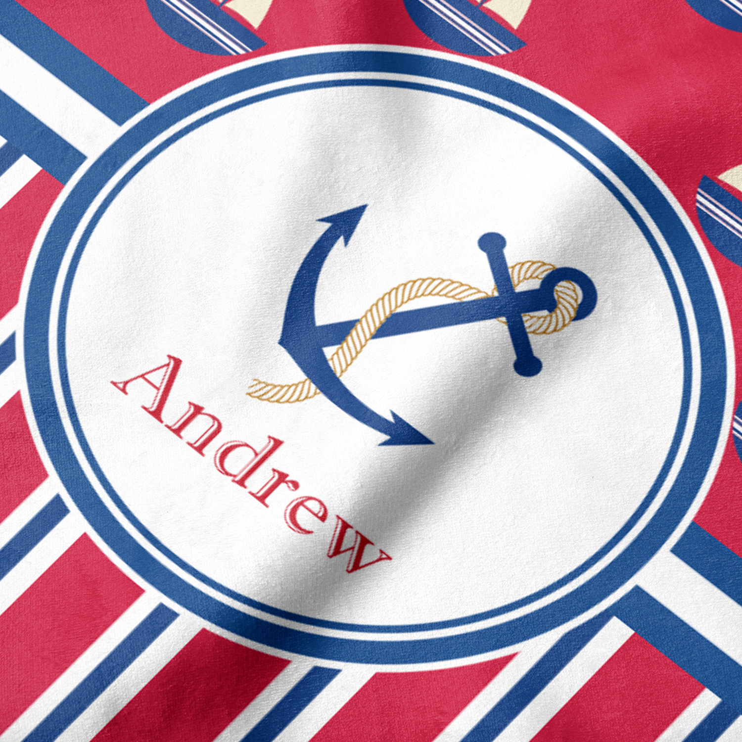 A porthole circle showcases an anchor and rope in the coordinating colors. Add your child's name for that personalized designer's touch.