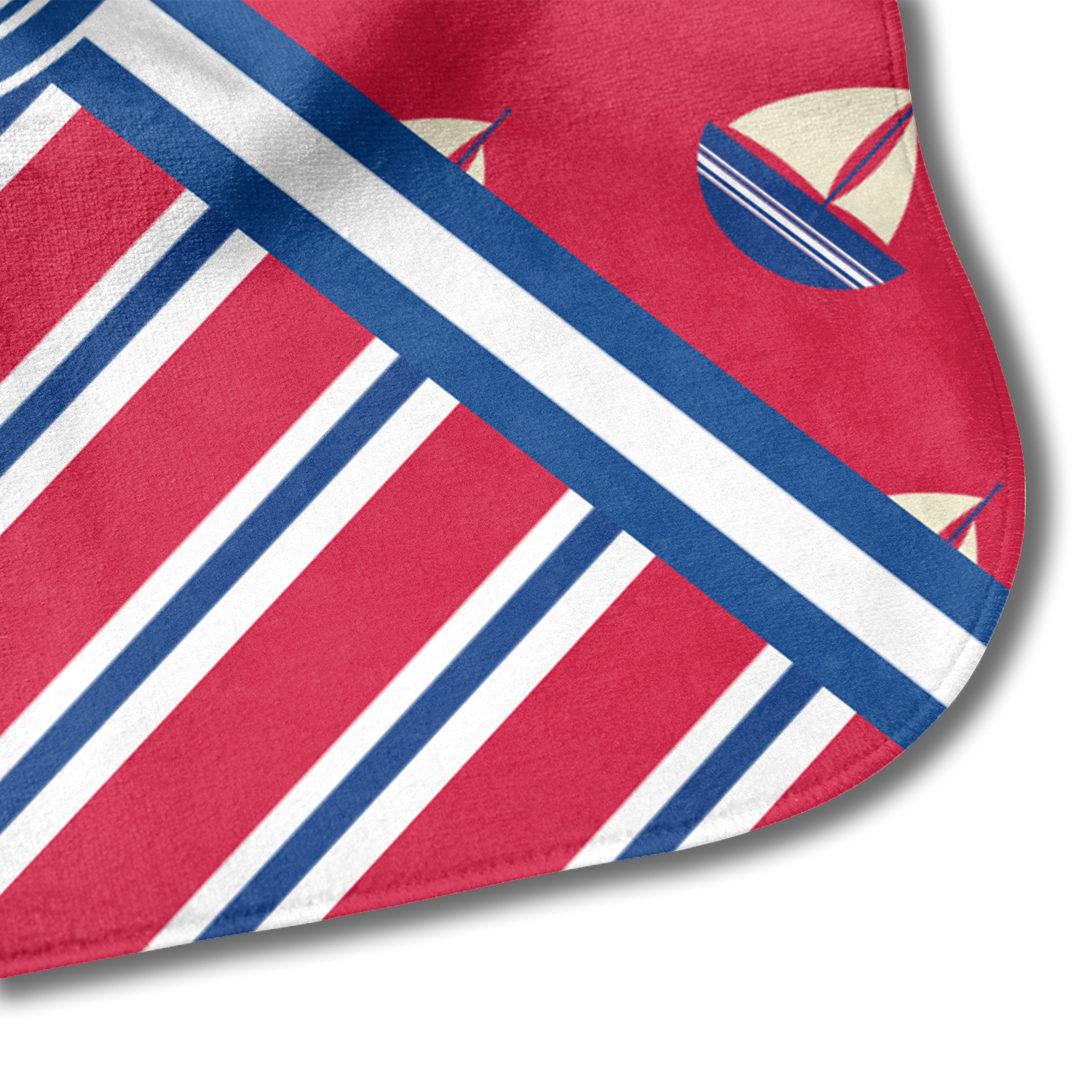 This look is just simply adorable. The sailboat design is nautical, fun, and yet still traditional. Using the classic colors of red, white, and blue these little sailboats are heading for the sunset in a backdrop of red. The bottom of the design uses the coordinating colors in a multi-striped pattern for that classic element in the pattern. A blue and white band that runs along the middle adds that timeless touch.