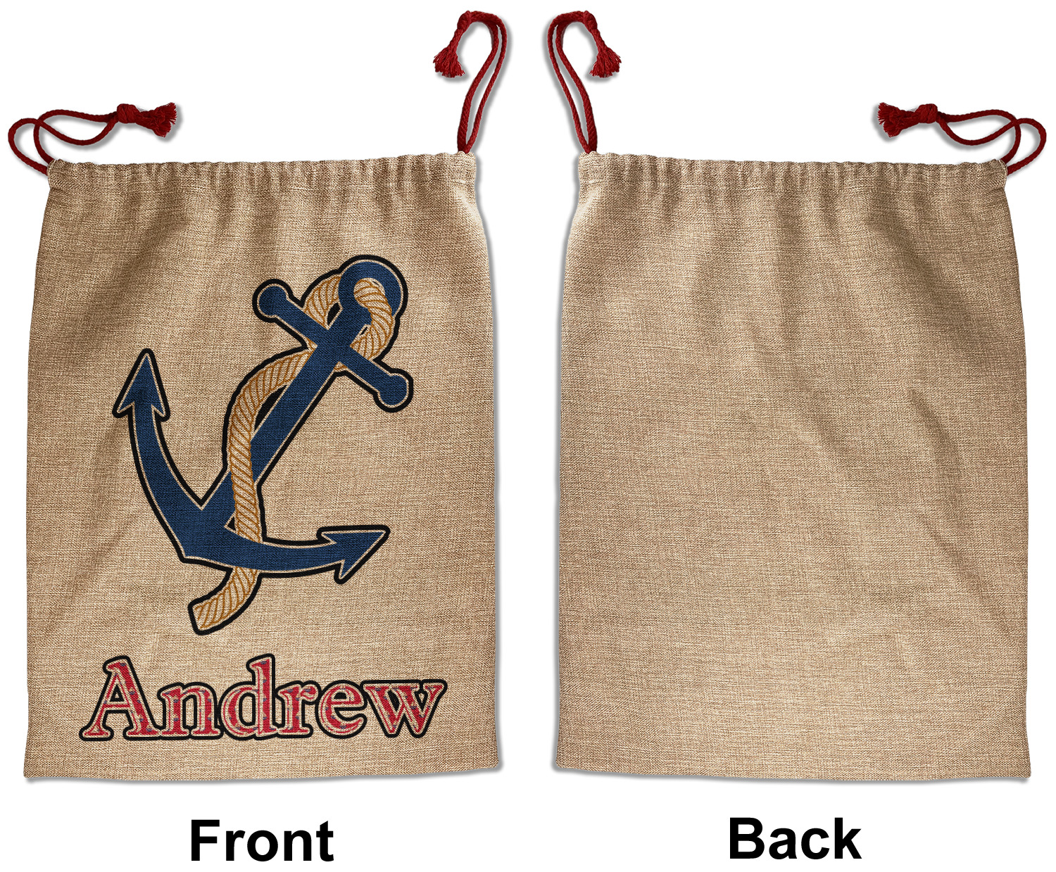 Our Santa sacks print your design on the burlap material giving it a nice rustic, natural design! The burlap material is also machine washable and wrinkle-free, so feel free to fold and store out Santa bags until the next time you need it! Secure your gifts with our red accent drawstring ties at the top of the sack so the mystery of your gift stays a surprise until Christmas day. We offer two types of printing- one side partial print or double-sided partial printing. Design and personalize your own Santa sack in time for the holidays!