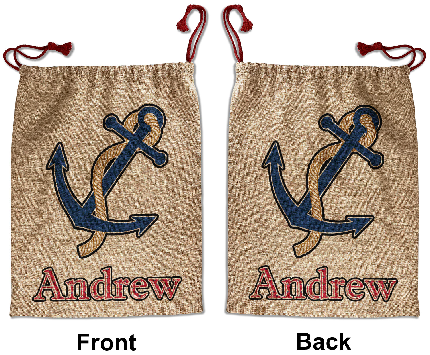 Our Santa sacks print your design on the burlap material giving it a nice rustic, natural design! The burlap material is also machine washable and wrinkle-free, so feel free to fold and store out Santa bags until the next time you need it! Secure your gifts with our red accent drawstring ties at the top of the sack so the mystery of your gift stays a surprise until Christmas day. We offer two types of printing- one side partial print or double-sided partial printing. Design and personalize your own Santa sack in time for the holidays!