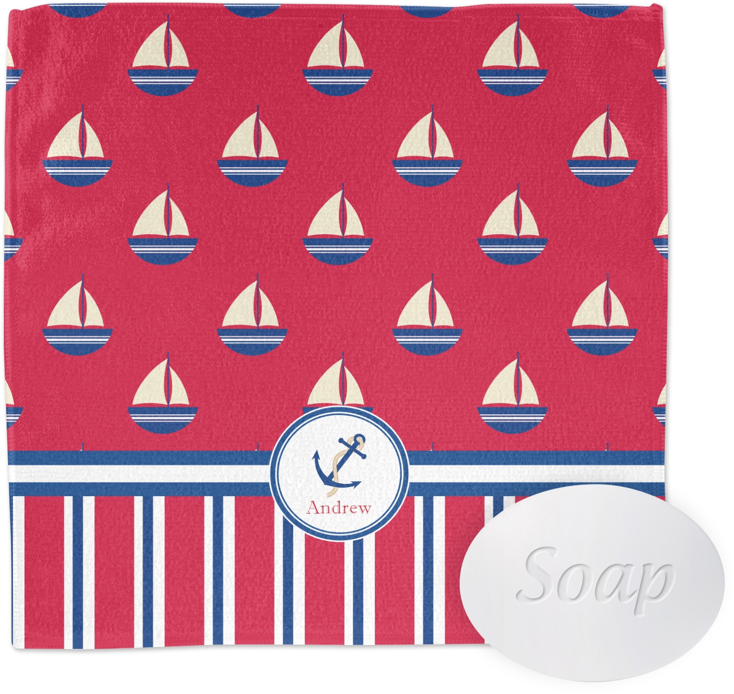 A porthole circle showcases an anchor and rope in the coordinating colors. Add your child's name for that personalized designer's touch.