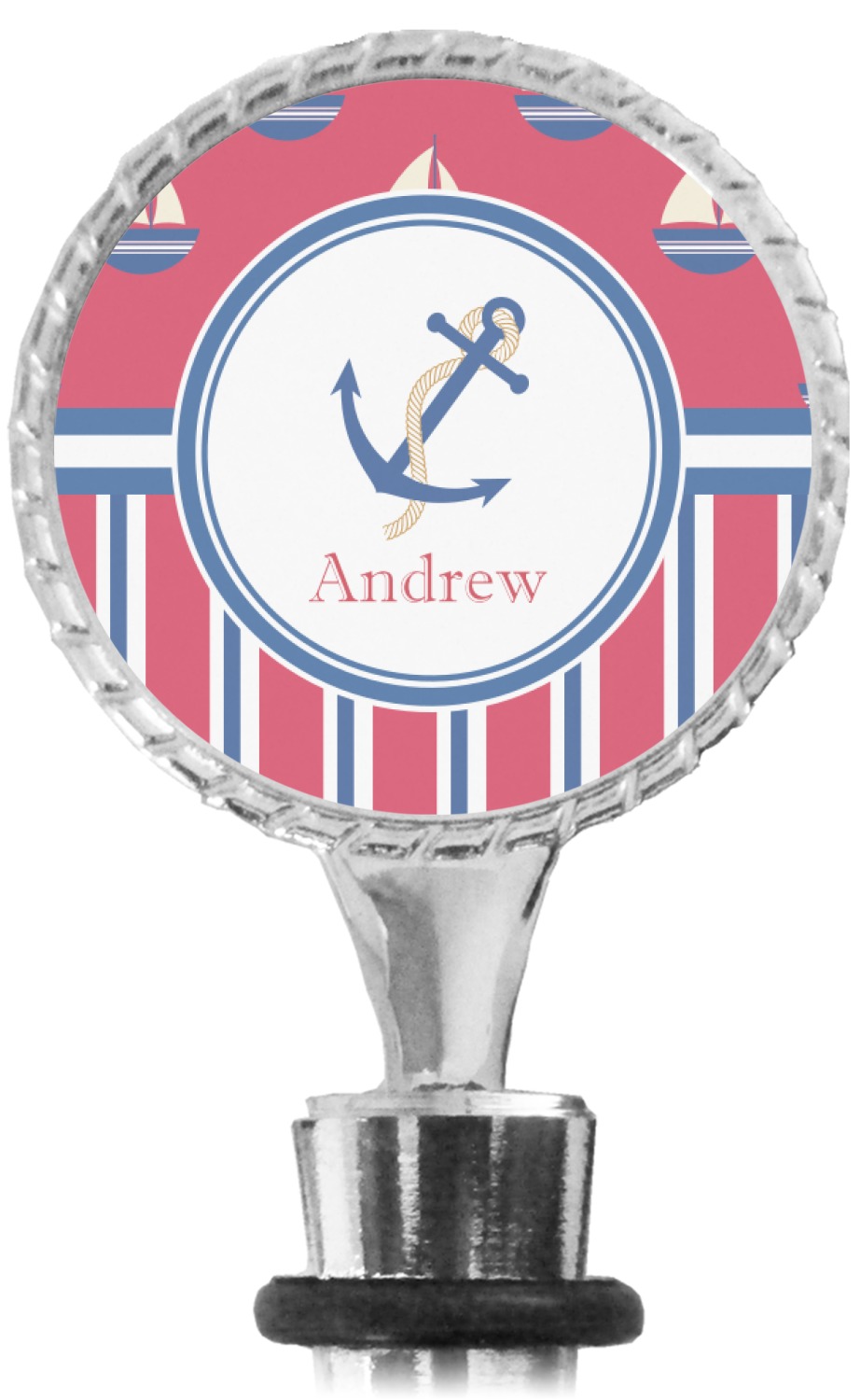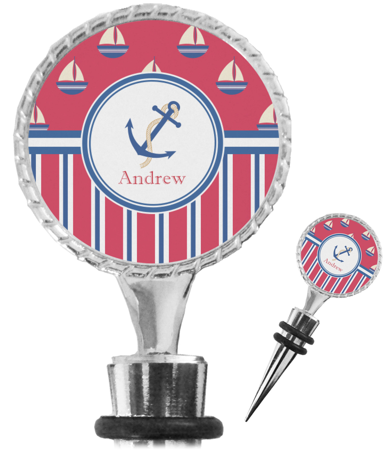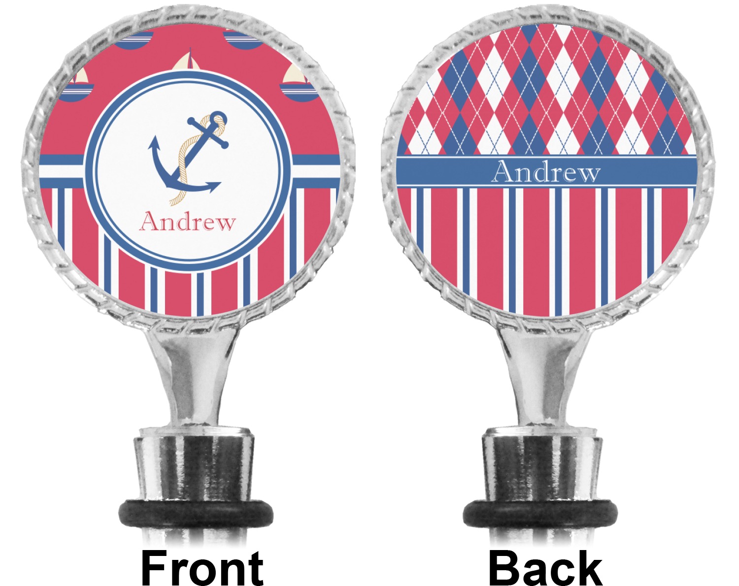 The top part of your bottle stopper is comprised of a zinc ring that displays your customization(s) in its middle, on both sides. The ring is heavy duty, with a bright chrome finish. The body of the wine stoppers have two silicone rings to provide an airtight seal. These wine bottle stoppers measure at 1.625" L x 0.8125" W x 4.625" H; your custom wine stopper is meant to fit into most standard-sized wine bottles.
