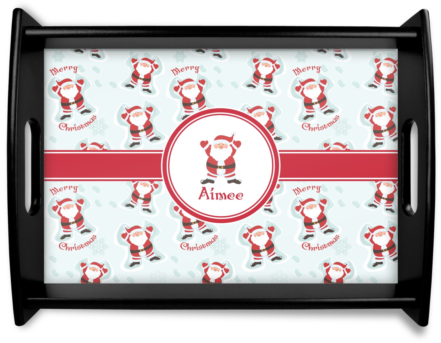 This serving tray with handles features square edges and two rounded sides, creating a very modern look. Each side is fabricated from a beautifully cut, natural wood. The bottom of the interior of the tray displays your customized design in bright, vibrant color. The tray is sold in both a black color and a natural wood look. Each variation of the wood serving tray has two sizes: Small, which is 14" x 10" x 2.25", and Large, which is 19.5" x 13.5" x 2.75".