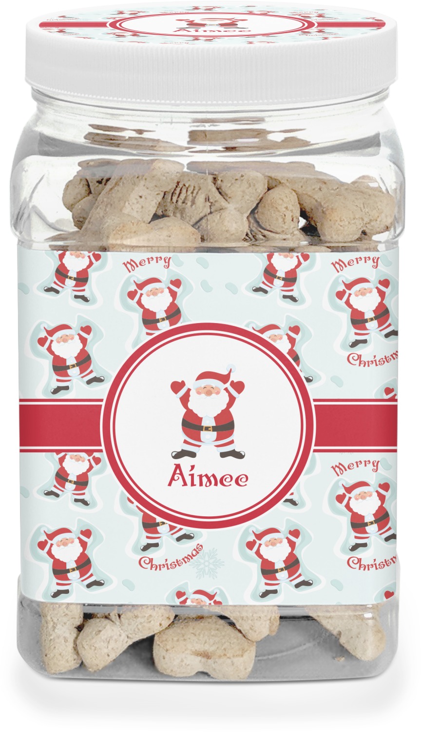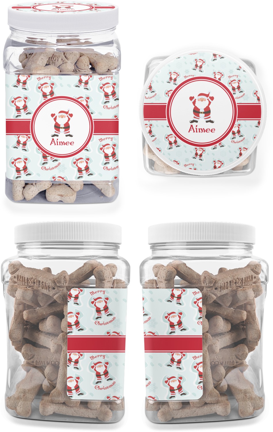 This half gallon jar, made from a sturdy plastic, is the perfect way to keep treats from any naughty pet paws, while still keeping them ready on hand for when your pup performs an impressive trick. This dog cookie jar features a screw-on, white lid that displays your personalized design on a vinyl sticker. We apply another customized sticker that wraps around the front and sides of the jar. Our dog treat jar also has indentations on the rear ends of the sides, which allows for convenient handling, and its square frame allows for easy storage.