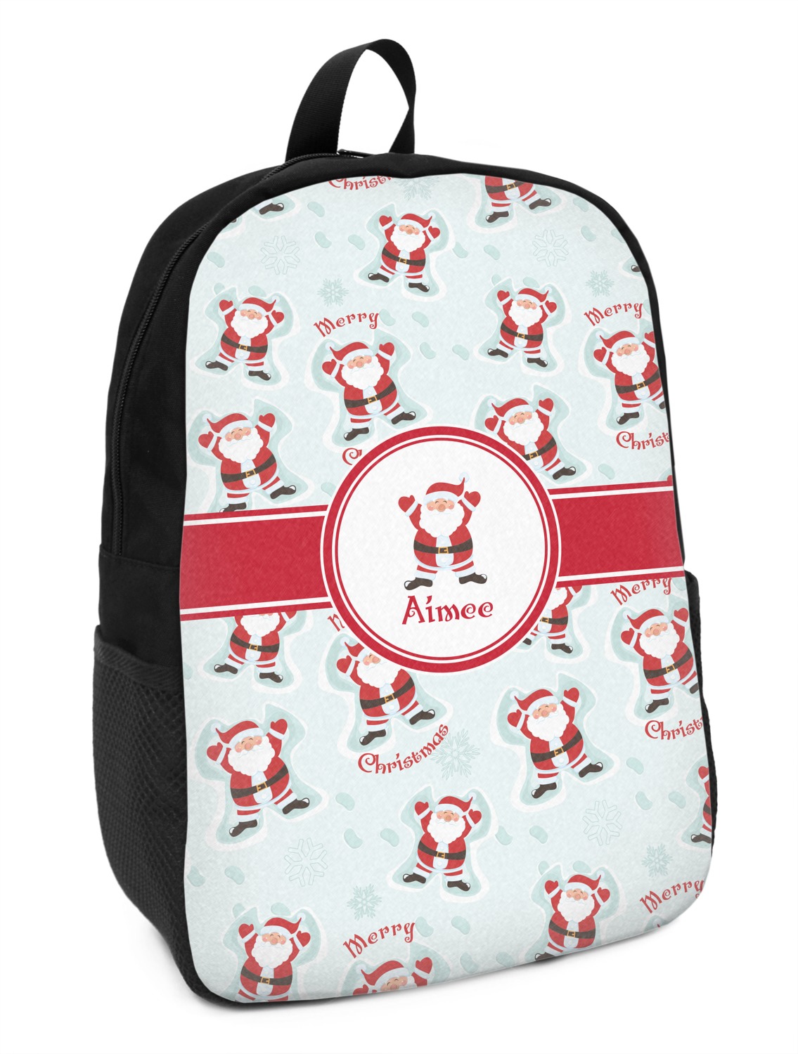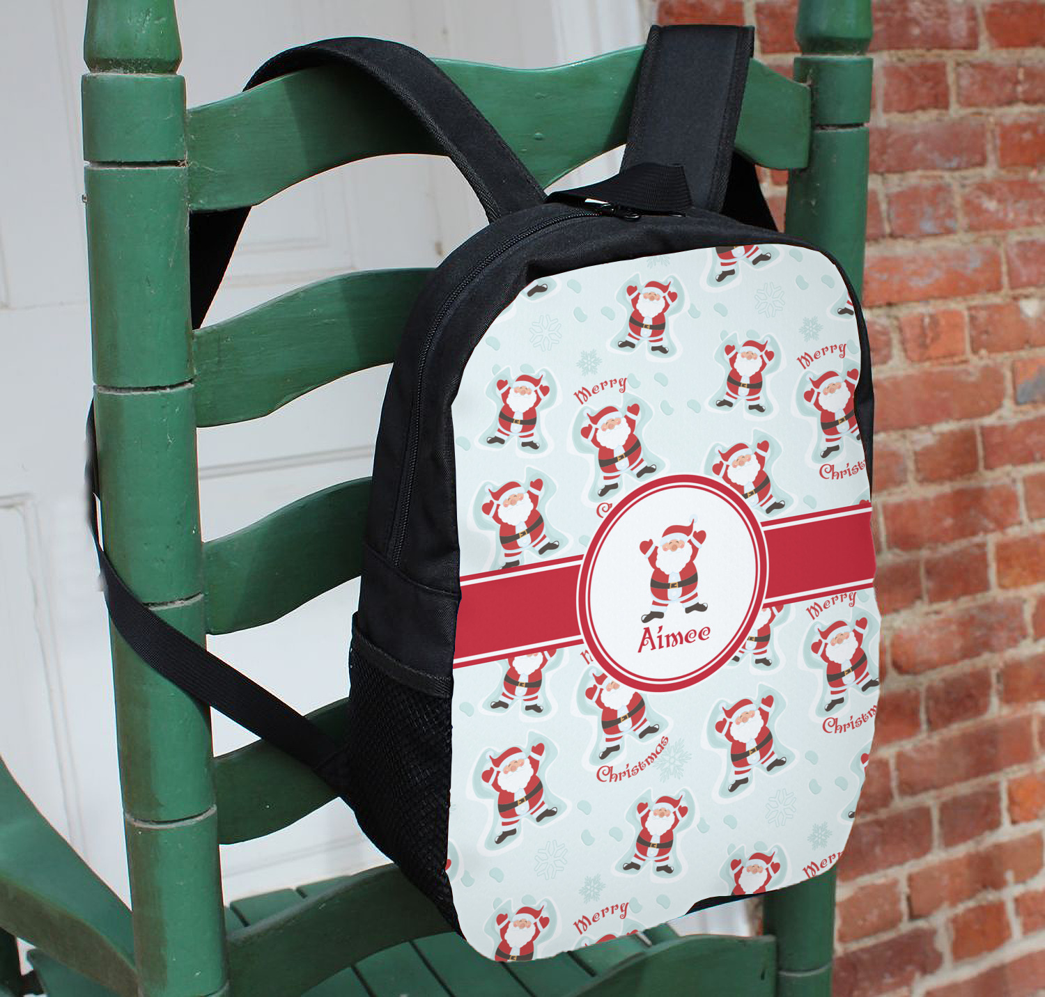 These small backpacks are made of a durable black canvas material with your personalization right on the front. The two shoulder straps are padded and easily adjustable. The bag itself measures at about 11" W x 15" H x 5" D. It's the perfect size for elementary aged kids or adults who want a smaller backpack. On the top of the bag you will find a handle to hang or carry your backpack by as well as a large zipper closure to keep all of your belongings safe inside. On each side of your backpack is a mesh pocket for a small item or water bottle. Inside your backpack you will find a spacious area with a small zipper pocket and a padded laptop slot that will fit up to a 13" laptop (13" being very snug). This is the perfect bag for any student that needs a couple books and their laptop with them at all times. It also works great as a carry on for traveling!