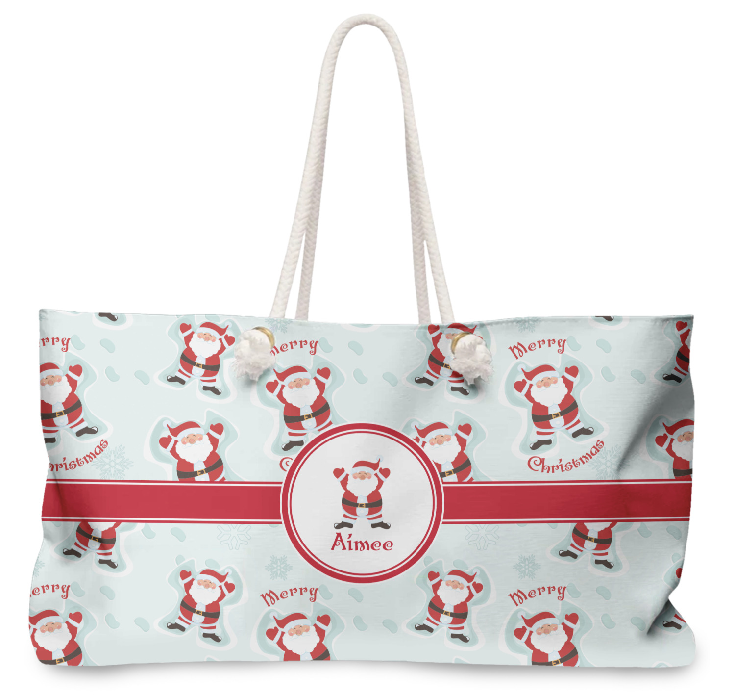 Our oversized weekender tote with rope handles is perfect for your weekend at the beach or on the town. This large tote are 24" W X 13" H, with a 5" gusset and a 27" thick rope handles with a knot that is put through a grommeted brass hole.