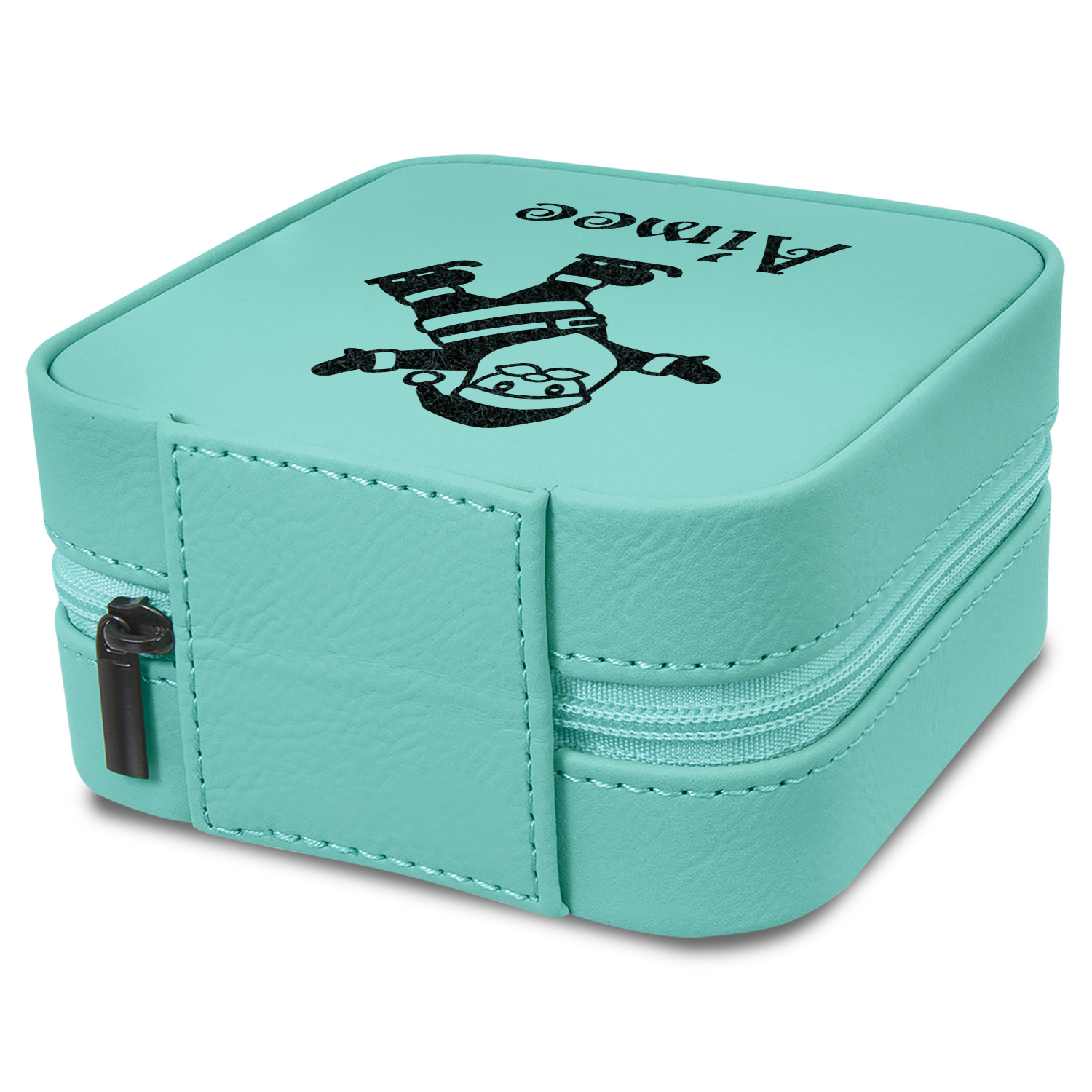This square zippered travel jewelry box is made from leatherette and is available in four colors - classic cognac / rawhide, a beautiful teal. navy blue or pink. The tan colored soft velvet inside has compartments and hooks for all your jewelry - rings, chains, earrings, bangles etc.