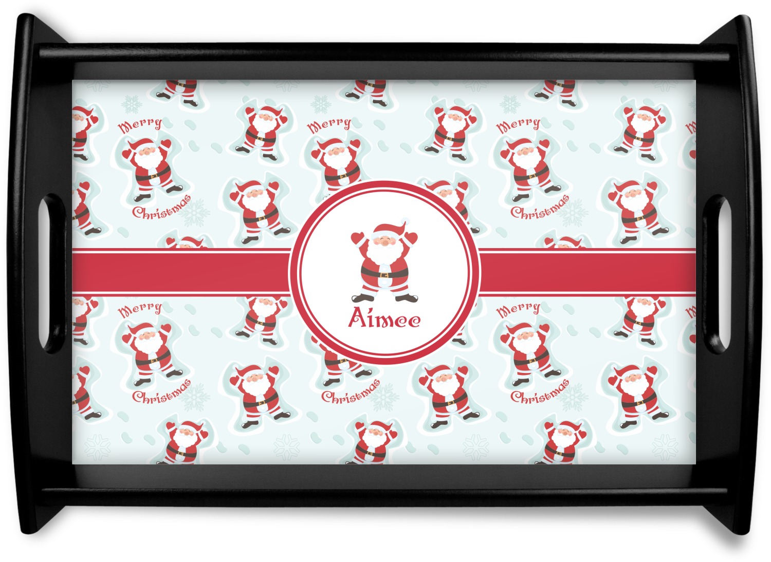 This serving tray with handles features square edges and two rounded sides, creating a very modern look. Each side is fabricated from a beautifully cut, natural wood. The bottom of the interior of the tray displays your customized design in bright, vibrant color. The tray is sold in both a black color and a natural wood look. Each variation of the wood serving tray has two sizes: Small, which is 14" x 10" x 2.25", and Large, which is 19.5" x 13.5" x 2.75".