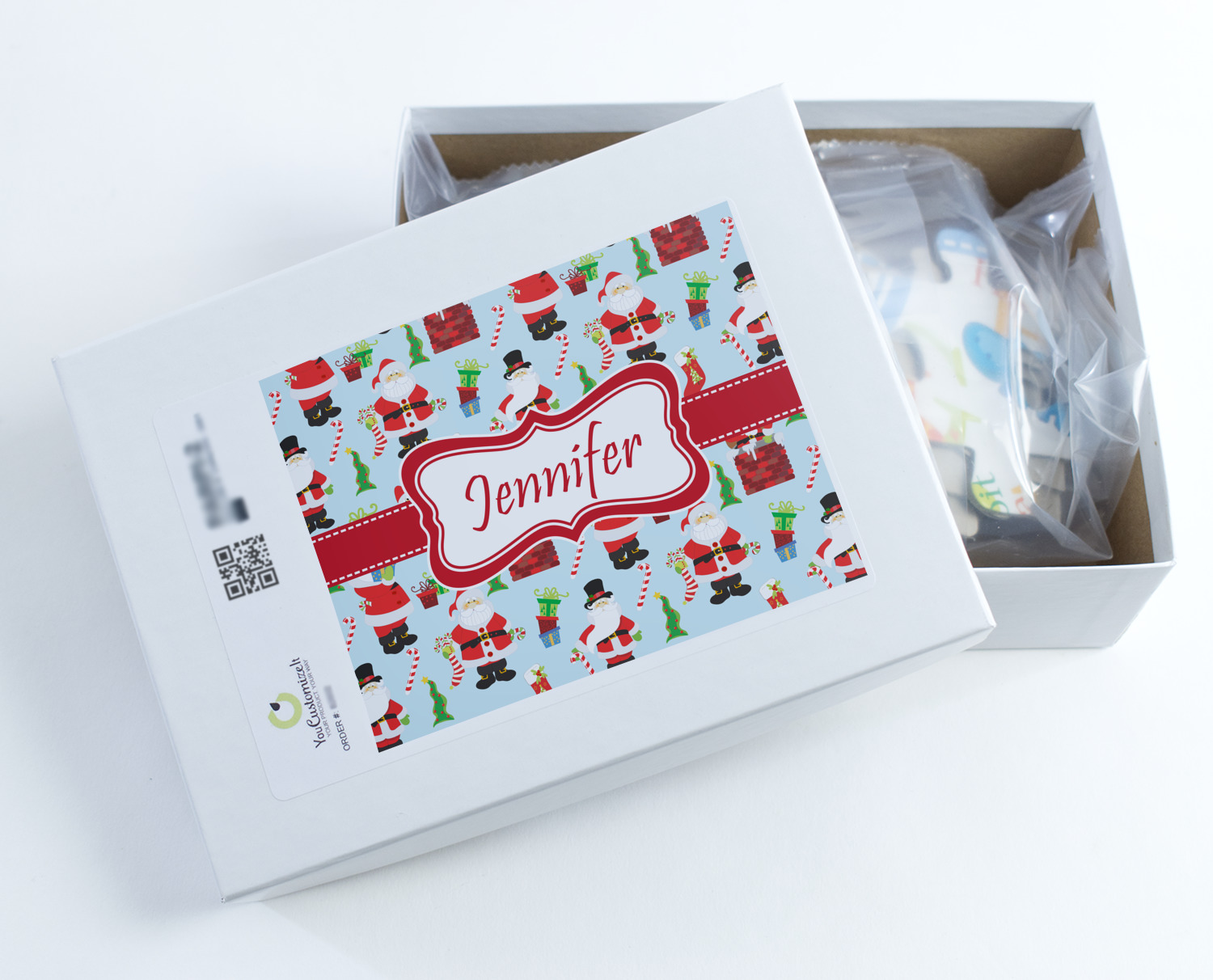 Believe in Santa Claus? Whether you do or not, this design is absolutely adorable with the background that has a cheerful Santa Claus all decked in his red and white, climbing down a chimney to leave presents upon presents and endless candy canes under your Christmas tree. The ribbon and label are red, and the label is the perfect place to put your name or text for personalization.