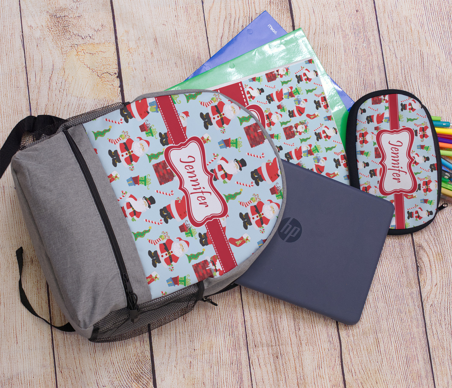 Believe in Santa Claus? Whether you do or not, this design is absolutely adorable with the background that has a cheerful Santa Claus all decked in his red and white, climbing down a chimney to leave presents upon presents and endless candy canes under your Christmas tree. The ribbon and label are red, and the label is the perfect place to put your name or text for personalization.