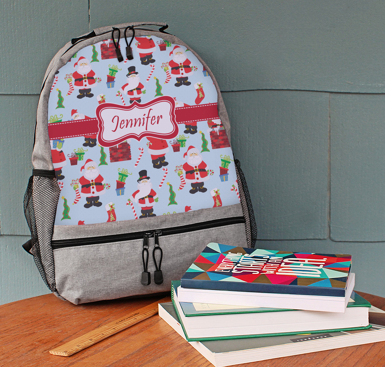 Believe in Santa Claus? Whether you do or not, this design is absolutely adorable with the background that has a cheerful Santa Claus all decked in his red and white, climbing down a chimney to leave presents upon presents and endless candy canes under your Christmas tree. The ribbon and label are red, and the label is the perfect place to put your name or text for personalization.