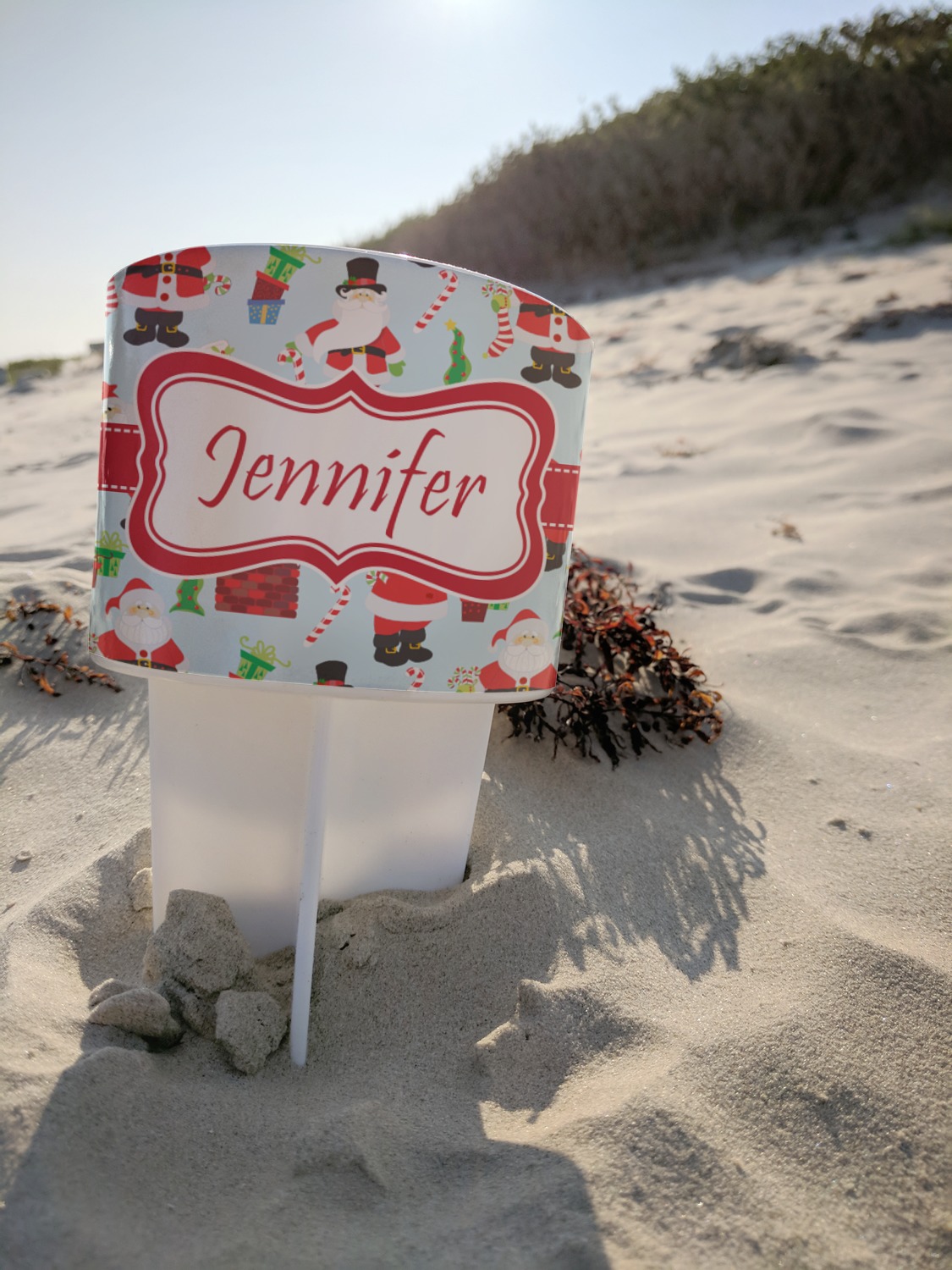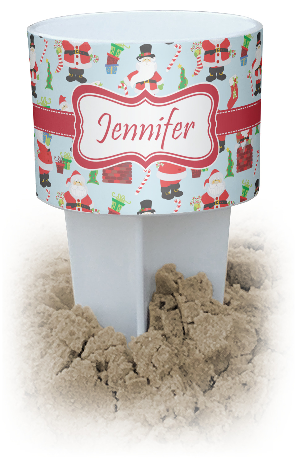 This cup holder has a large stake at its bottom that anchors it to the sand or ground below, while the cup holder rests above the stake. The entire drink holder is made of durable plastic and displays your customization around the cup holder portion. We sell these personalized beach spikers in two different colors: black and white.