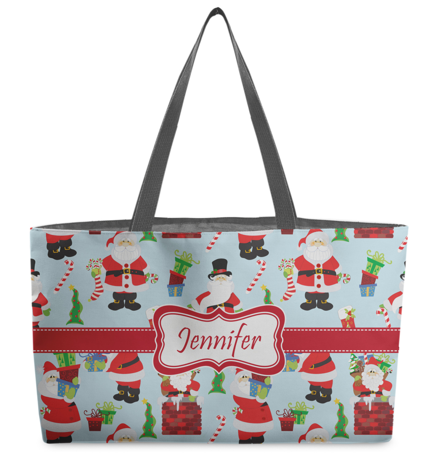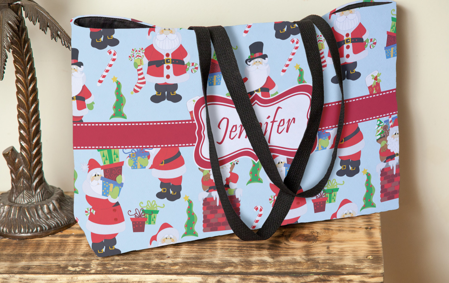These beach totes are handmade here in the USA. Fabric is printed with your design. The tote is then sewn from the fabric pieces, lining and handles added.