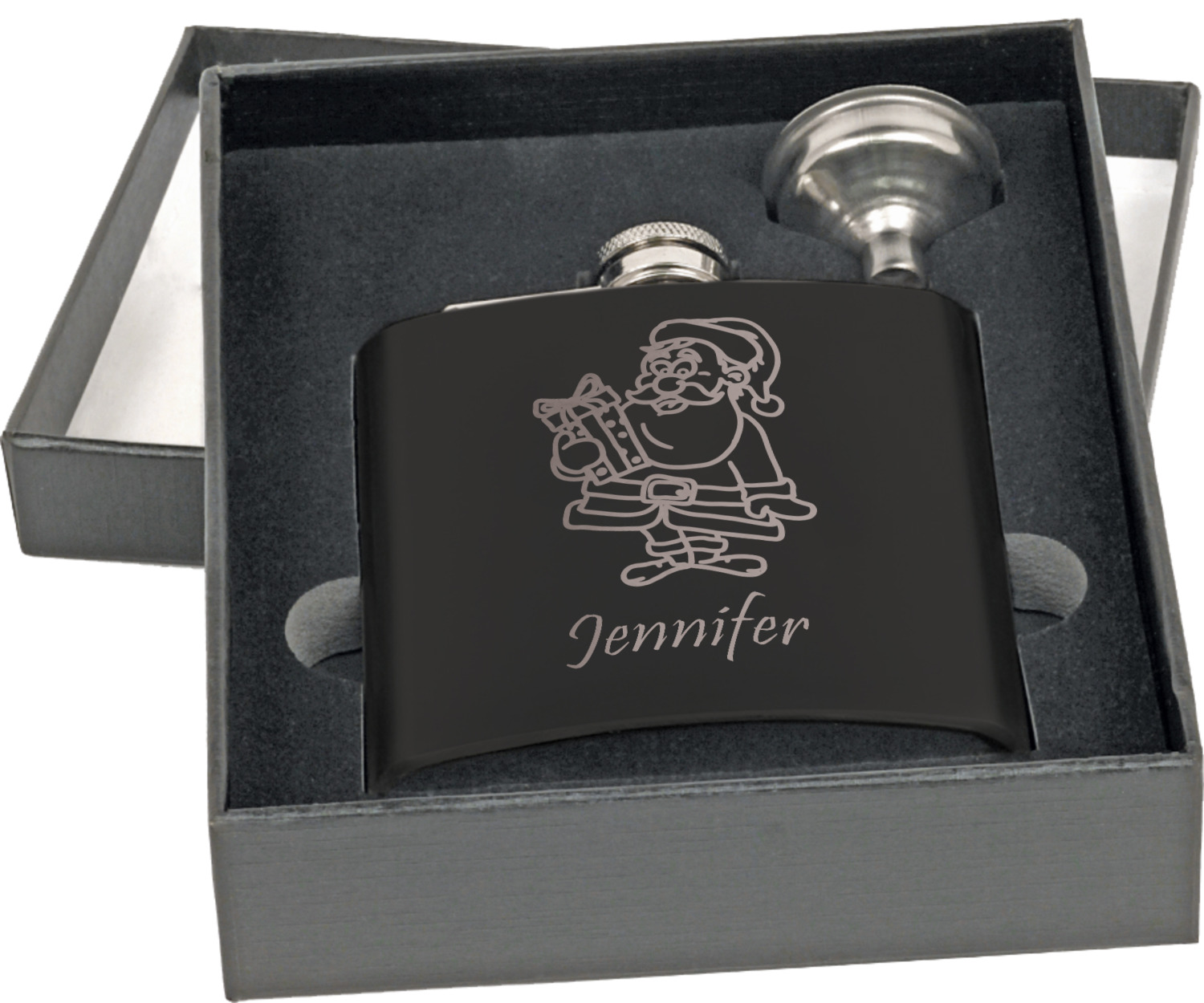 Built from a stainless steel and then covered with a black coating, this hip flask, has a very classy appearance. Similar to the standard flask, this stainless steel flask has the traditional curved shape for a snug fit in your palm. This flask set also includes a traditional screw and flip lid and liquid funnel in a gift box. At 4 by 4.5 inches, this flask can hold up to 6 ounces. Your personalized design is laser-engraved across the front of this flask.