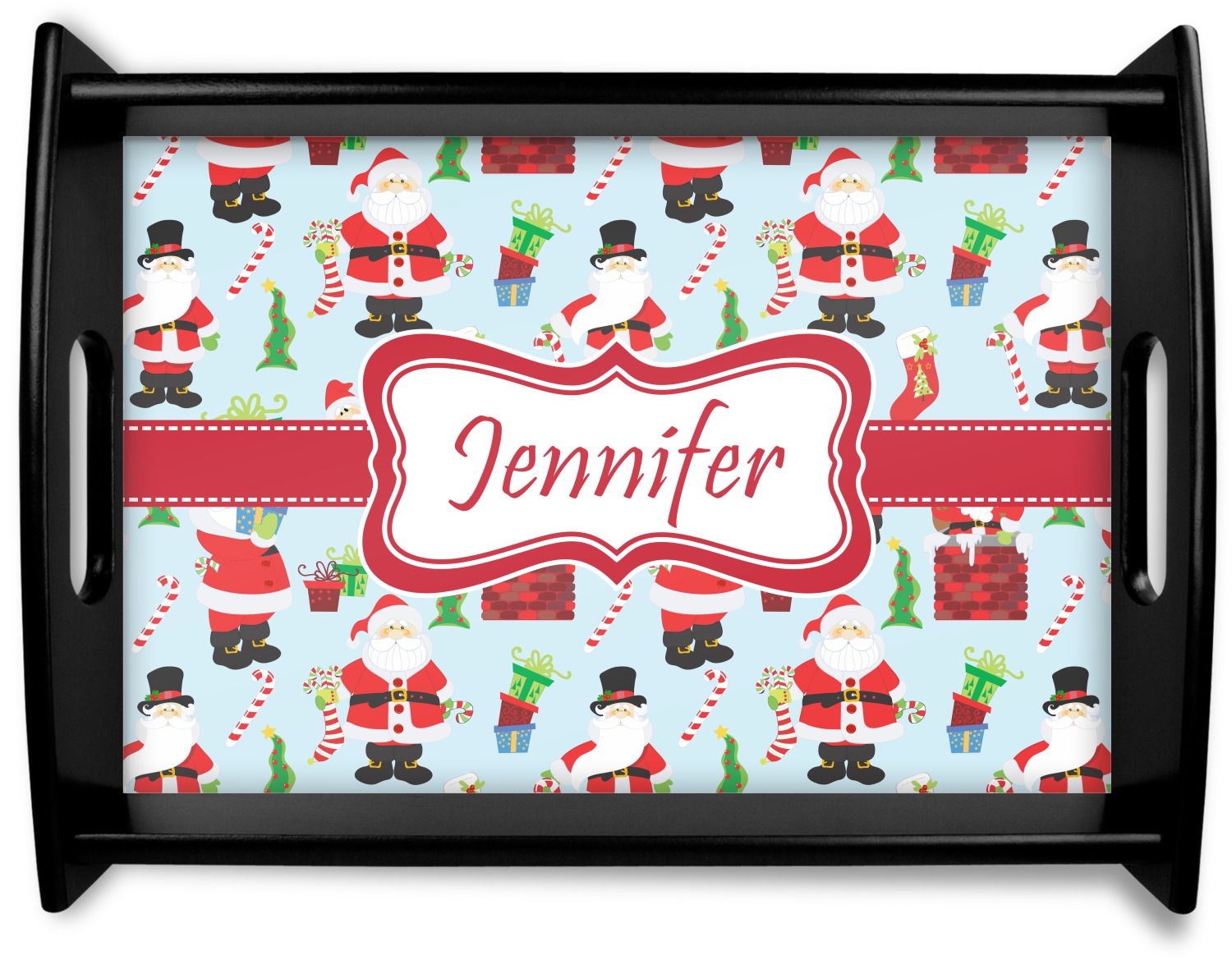 This serving tray with handles features square edges and two rounded sides, creating a very modern look. Each side is fabricated from a beautifully cut, natural wood. The bottom of the interior of the tray displays your customized design in bright, vibrant color. The tray is sold in both a black color and a natural wood look. Each variation of the wood serving tray has two sizes: Small, which is 14" x 10" x 2.25", and Large, which is 19.5" x 13.5" x 2.75".