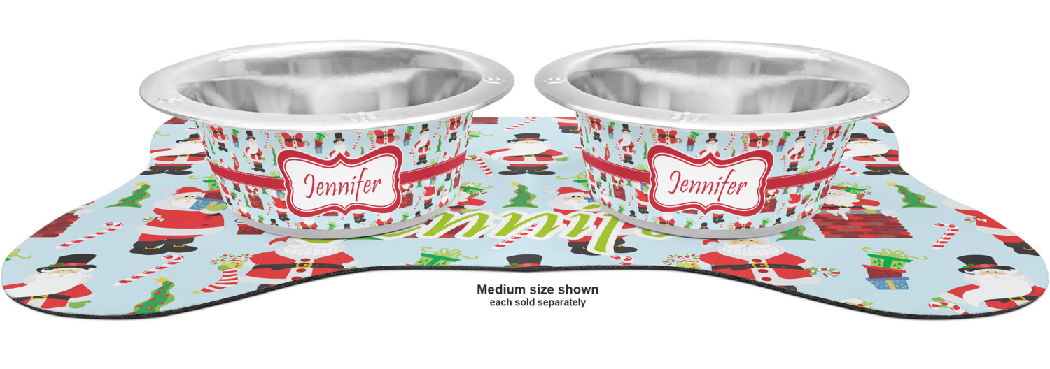 The top of this mat displays your custom design, as it is printed on polyester. To prevent slippage, the underside of the mat is made of rubber. We offer a small dog food mat, suitable for smaller dogs and a large dog food mat for bigger breeds. The small dog food mat is approximately 19 by 13 inches, while the large dog feeding mat measures at approximately 26.75 by 18 inches. Both personalized mats are ideally sized to fit two dog bowls.