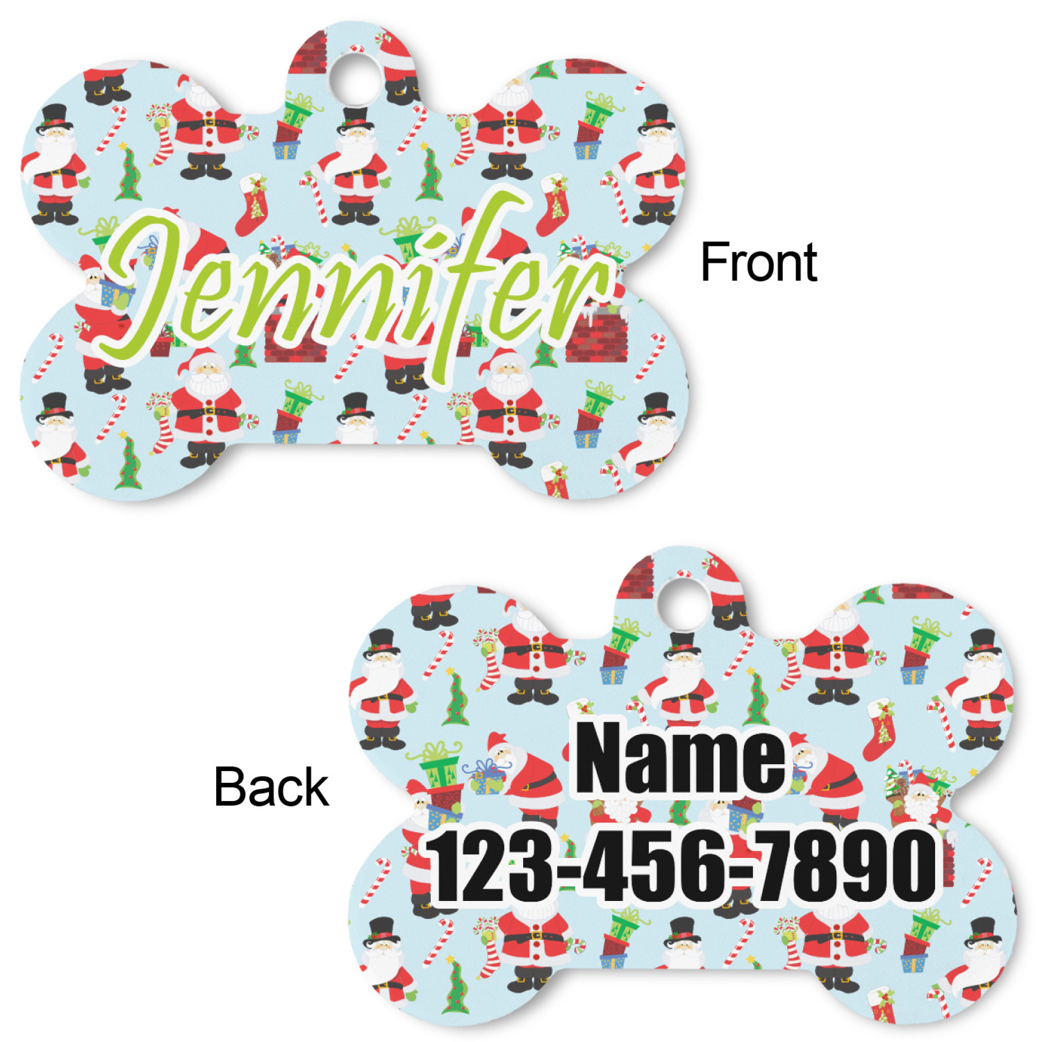 Our default design templates print your dog's personalization on the front and your contact information on the back; however everything is customizable, so you customize the patterns, the colors, the personalization, the contact information etc.
