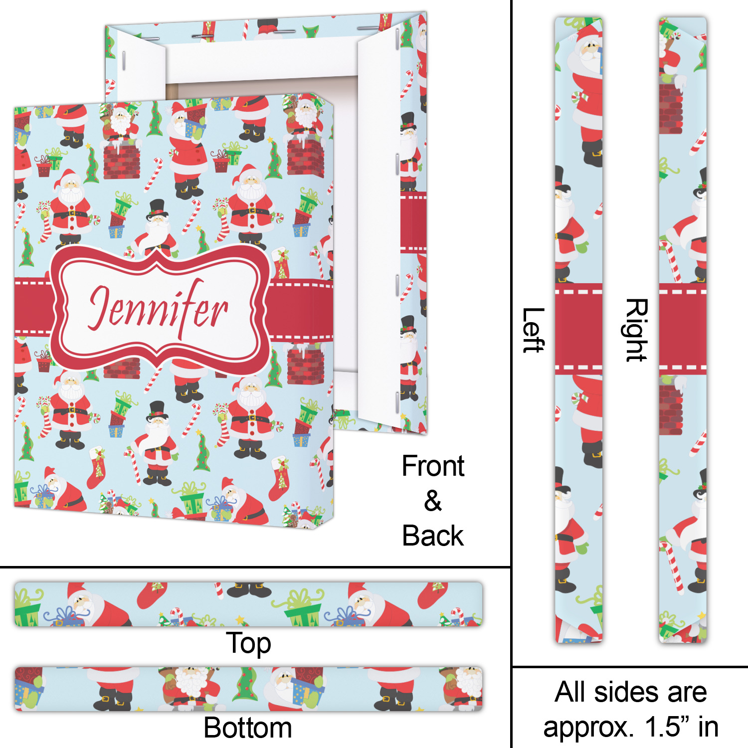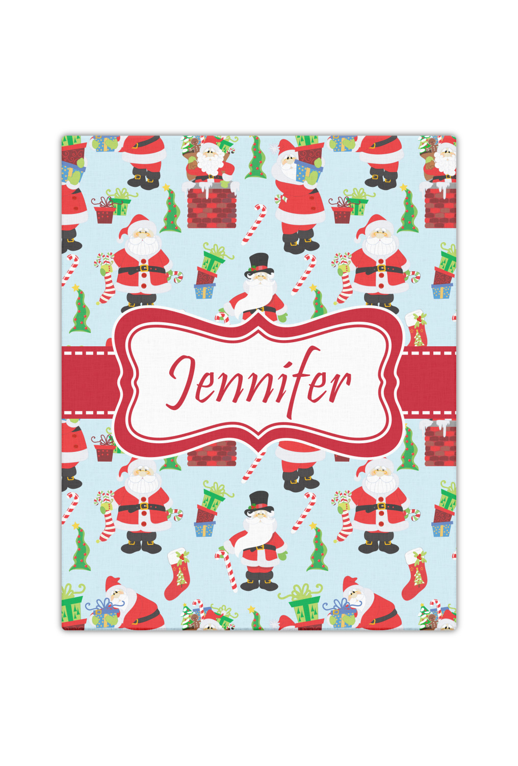 Believe in Santa Claus? Whether you do or not, this design is absolutely adorable with the background that has a cheerful Santa Claus all decked in his red and white, climbing down a chimney to leave presents upon presents and endless candy canes under your Christmas tree. The ribbon and label are red, and the label is the perfect place to put your name or text for personalization.