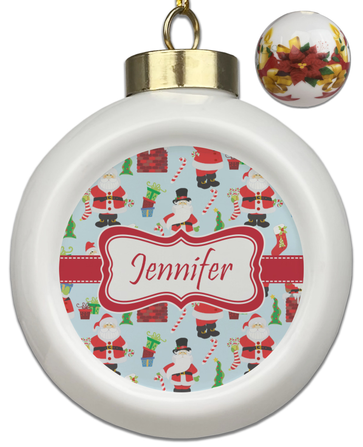 Our Christmas ornaments are a unique ceramic ball shape with a twist as it has a flat face to display your custom design! Select from one of our two design types - Christmas Tree or Poinsettia Garland - to adorn the curved back of your personal design. Each ornament measures 3H x 2.5W x 2D accompanied with a gold string accent for finishing touches to hang on your beautiful Christmas tree!