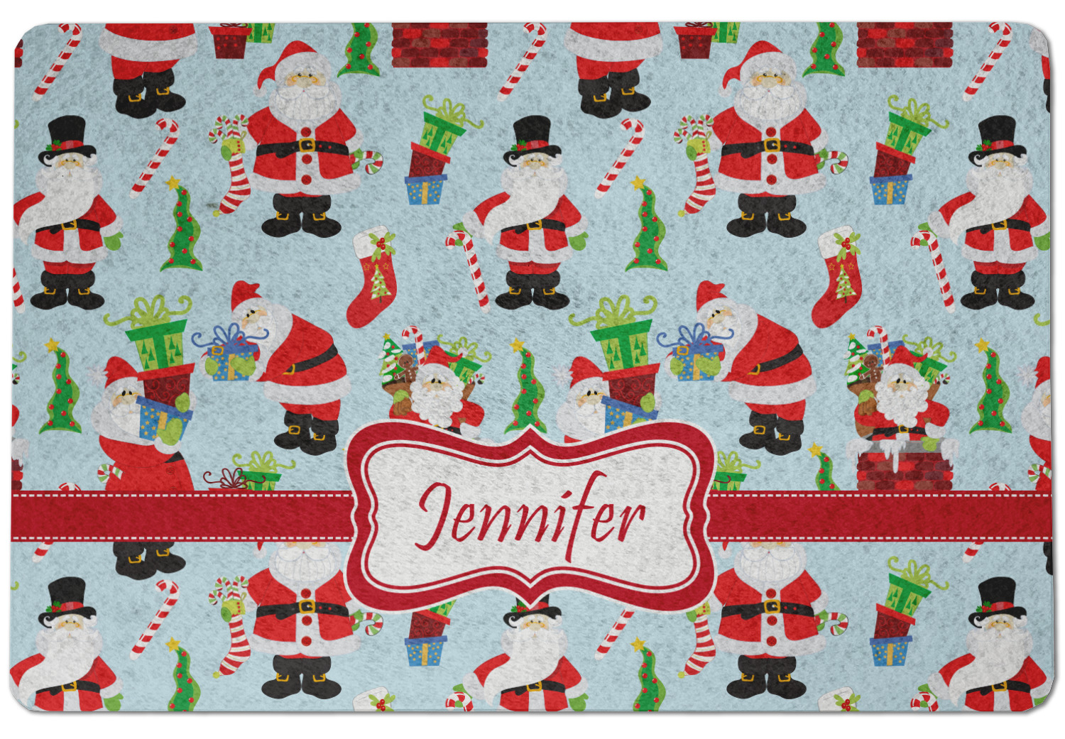 Believe in Santa Claus? Whether you do or not, this design is absolutely adorable with the background that has a cheerful Santa Claus all decked in his red and white, climbing down a chimney to leave presents upon presents and endless candy canes under your Christmas tree. The ribbon and label are red, and the label is the perfect place to put your name or text for personalization.