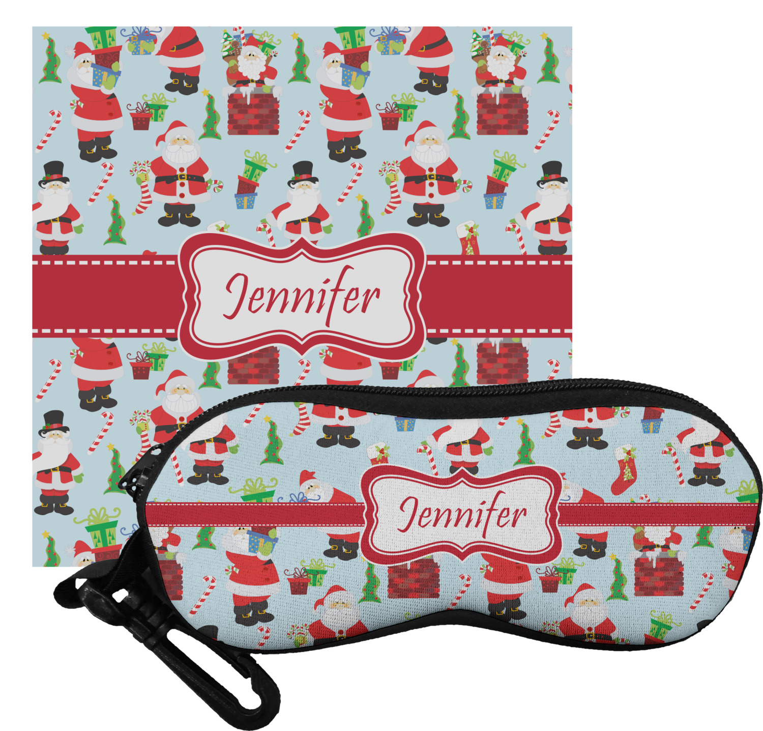 The cases have the design on both sides, a black zipper, and clips for hanging on a belt buckle or purse strap and also include matching lens cloths.