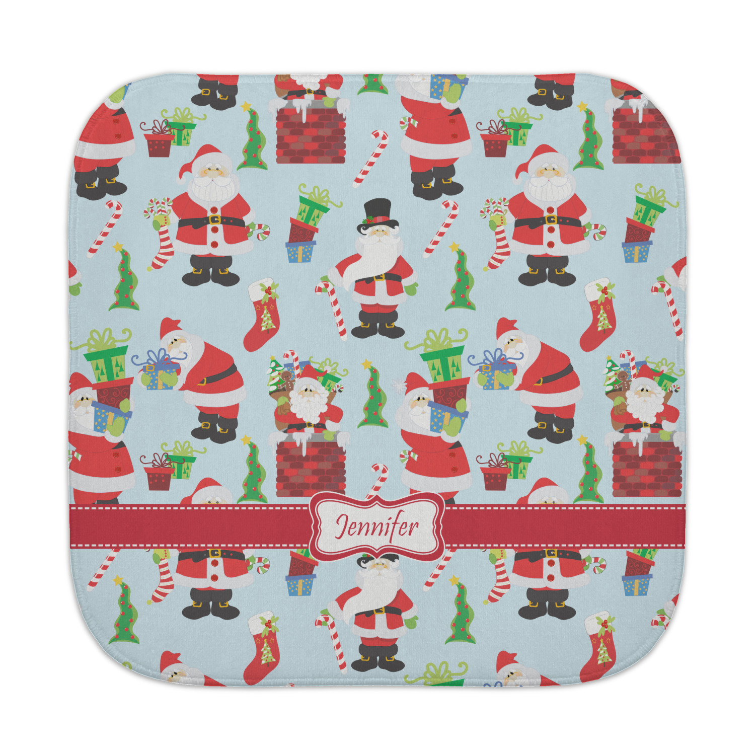 Believe in Santa Claus? Whether you do or not, this design is absolutely adorable with the background that has a cheerful Santa Claus all decked in his red and white, climbing down a chimney to leave presents upon presents and endless candy canes under your Christmas tree. The ribbon and label are red, and the label is the perfect place to put your name or text for personalization.