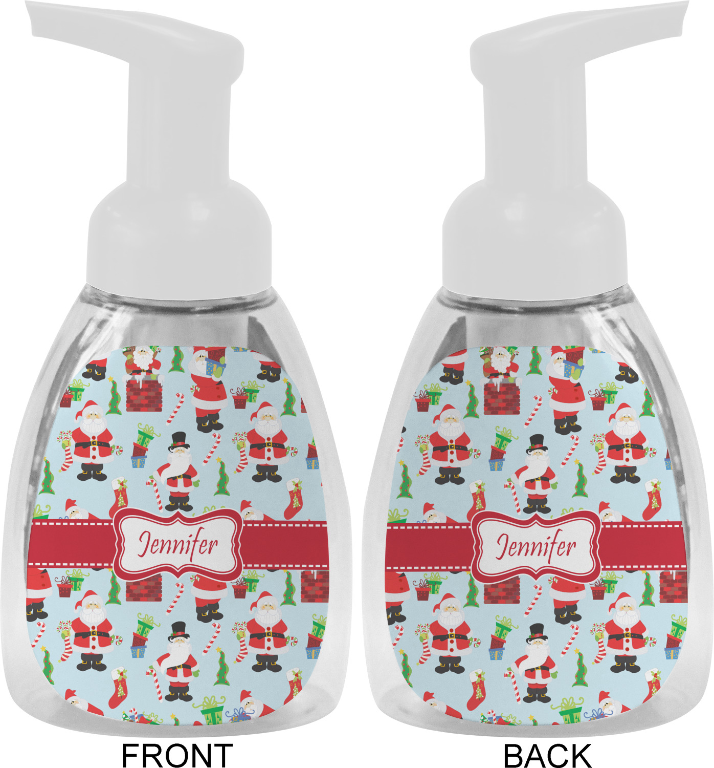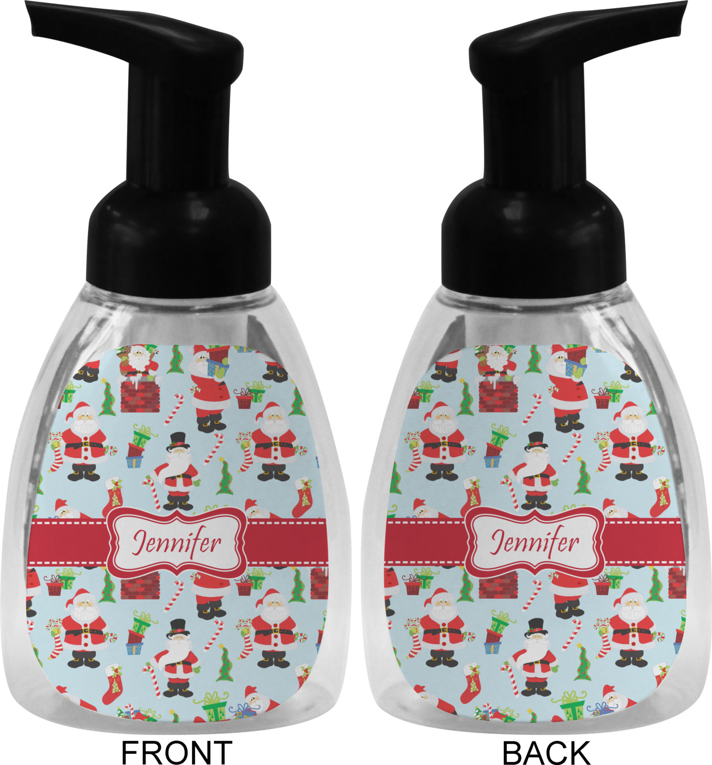 This soap dispenser is made of a robust plastic and has a clear base. The included soap pump is available in black or white color. This dispenser is 6.5 inches tall, 3 inches wide, and 2 inches deep. We display your customized designs on the front and back sides of these foaming hand soap dispensers.