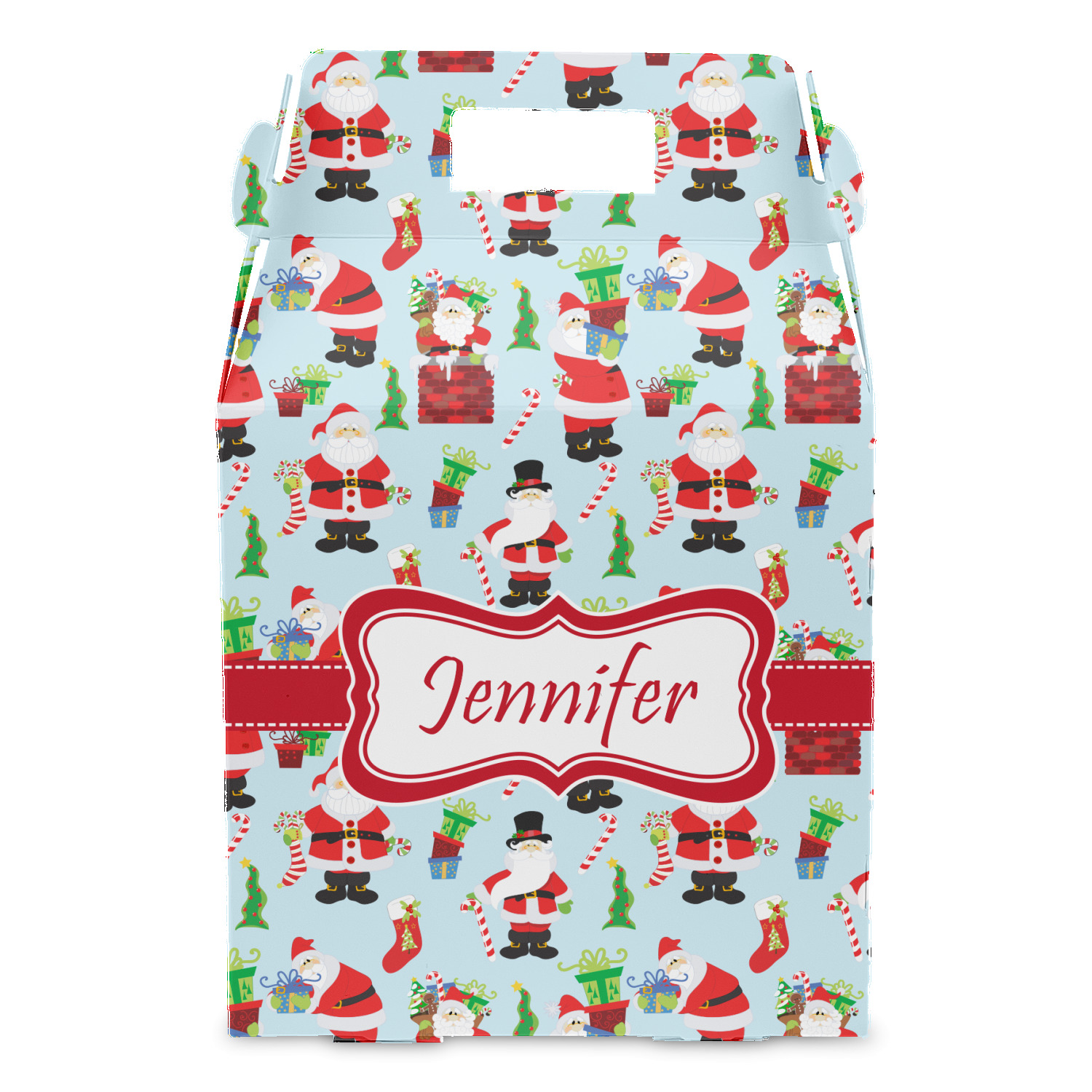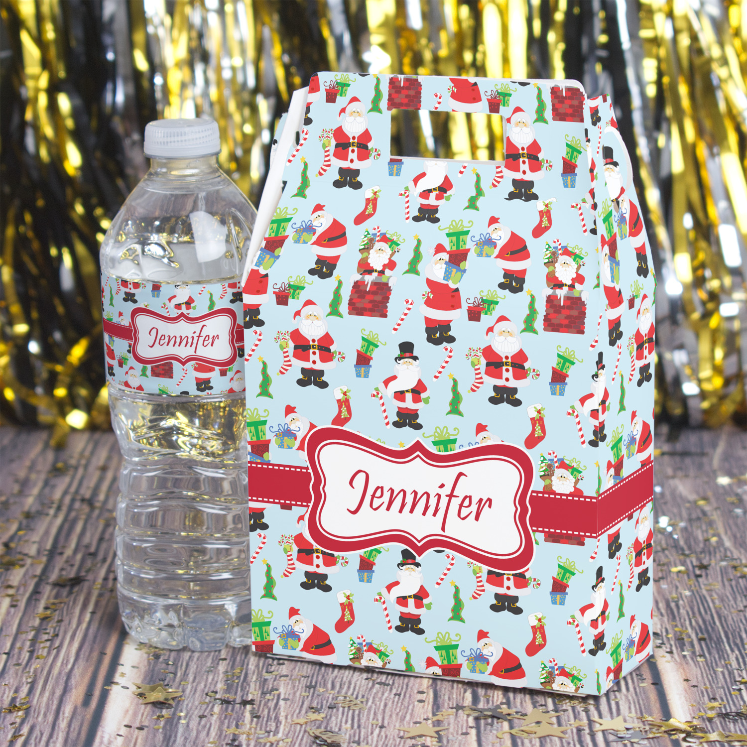 Believe in Santa Claus? Whether you do or not, this design is absolutely adorable with the background that has a cheerful Santa Claus all decked in his red and white, climbing down a chimney to leave presents upon presents and endless candy canes under your Christmas tree. The ribbon and label are red, and the label is the perfect place to put your name or text for personalization.