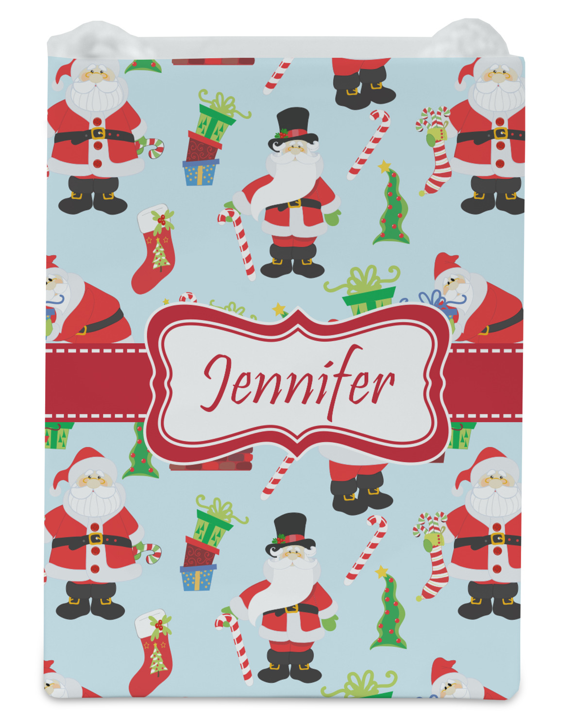 Believe in Santa Claus? Whether you do or not, this design is absolutely adorable with the background that has a cheerful Santa Claus all decked in his red and white, climbing down a chimney to leave presents upon presents and endless candy canes under your Christmas tree. The ribbon and label are red, and the label is the perfect place to put your name or text for personalization.