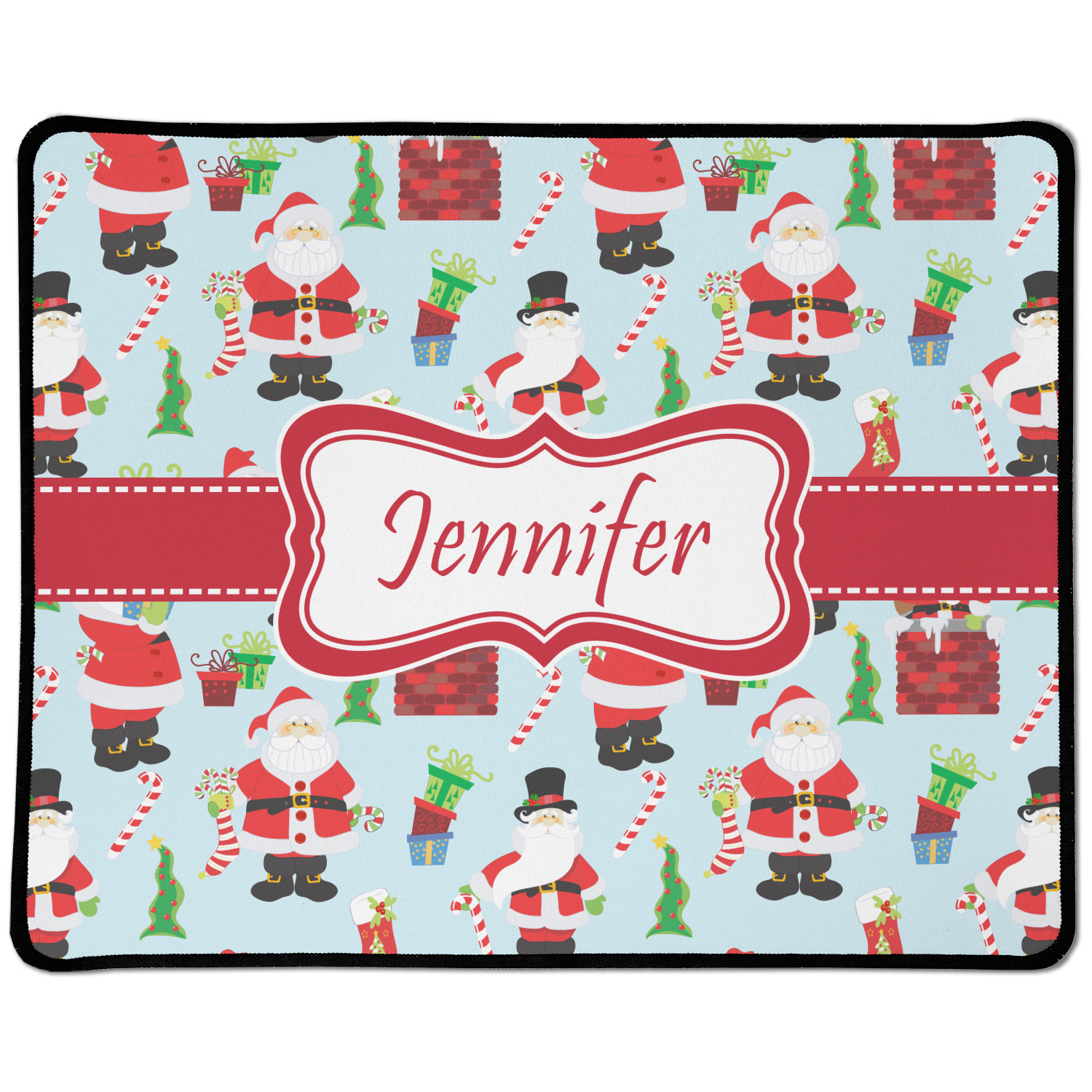 Believe in Santa Claus? Whether you do or not, this design is absolutely adorable with the background that has a cheerful Santa Claus all decked in his red and white, climbing down a chimney to leave presents upon presents and endless candy canes under your Christmas tree. The ribbon and label are red, and the label is the perfect place to put your name or text for personalization.