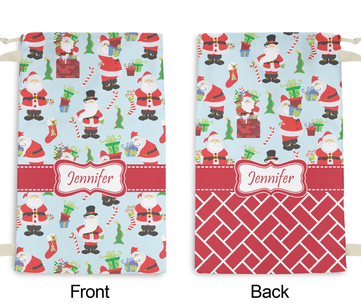 Believe in Santa Claus? Whether you do or not, this design is absolutely adorable with the background that has a cheerful Santa Claus all decked in his red and white, climbing down a chimney to leave presents upon presents and endless candy canes under your Christmas tree. The ribbon and label are red, and the label is the perfect place to put your name or text for personalization.