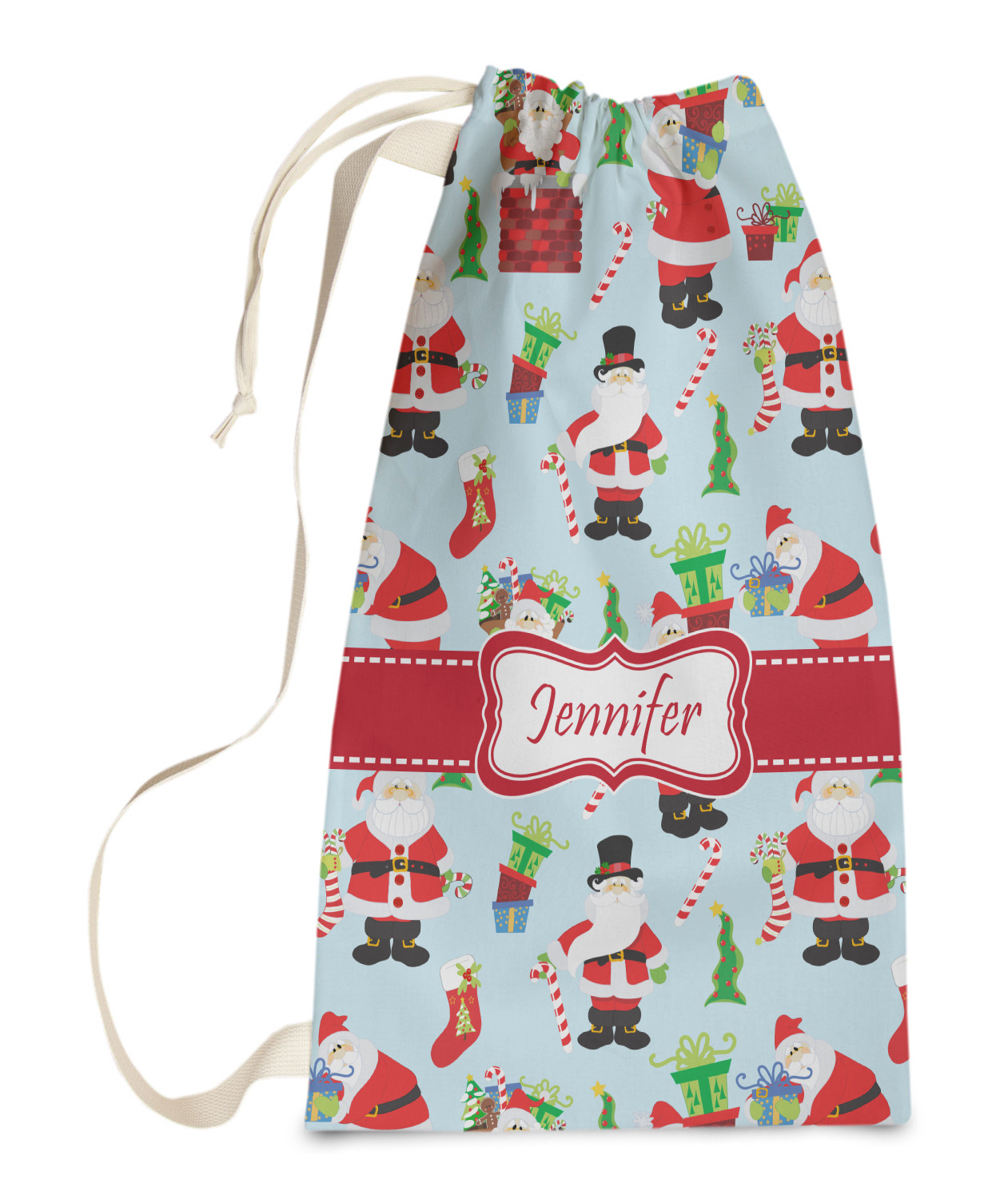 Carry your laundry in style with these customized laundry bags. Available in two sizes, featuring a natural colored woven strap and a cinch cord, these bags hold a lot of clothes or anything else you want to fit in them.