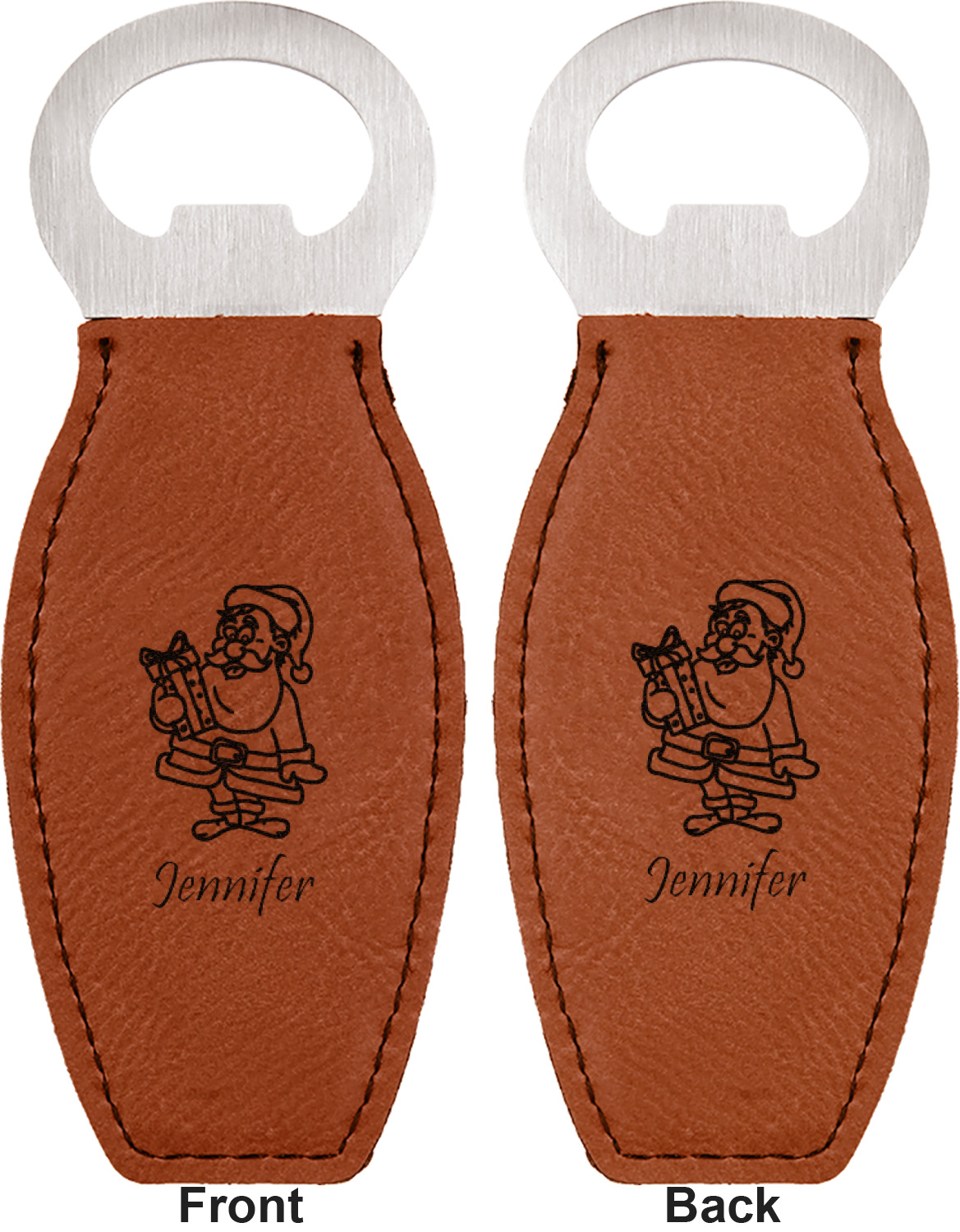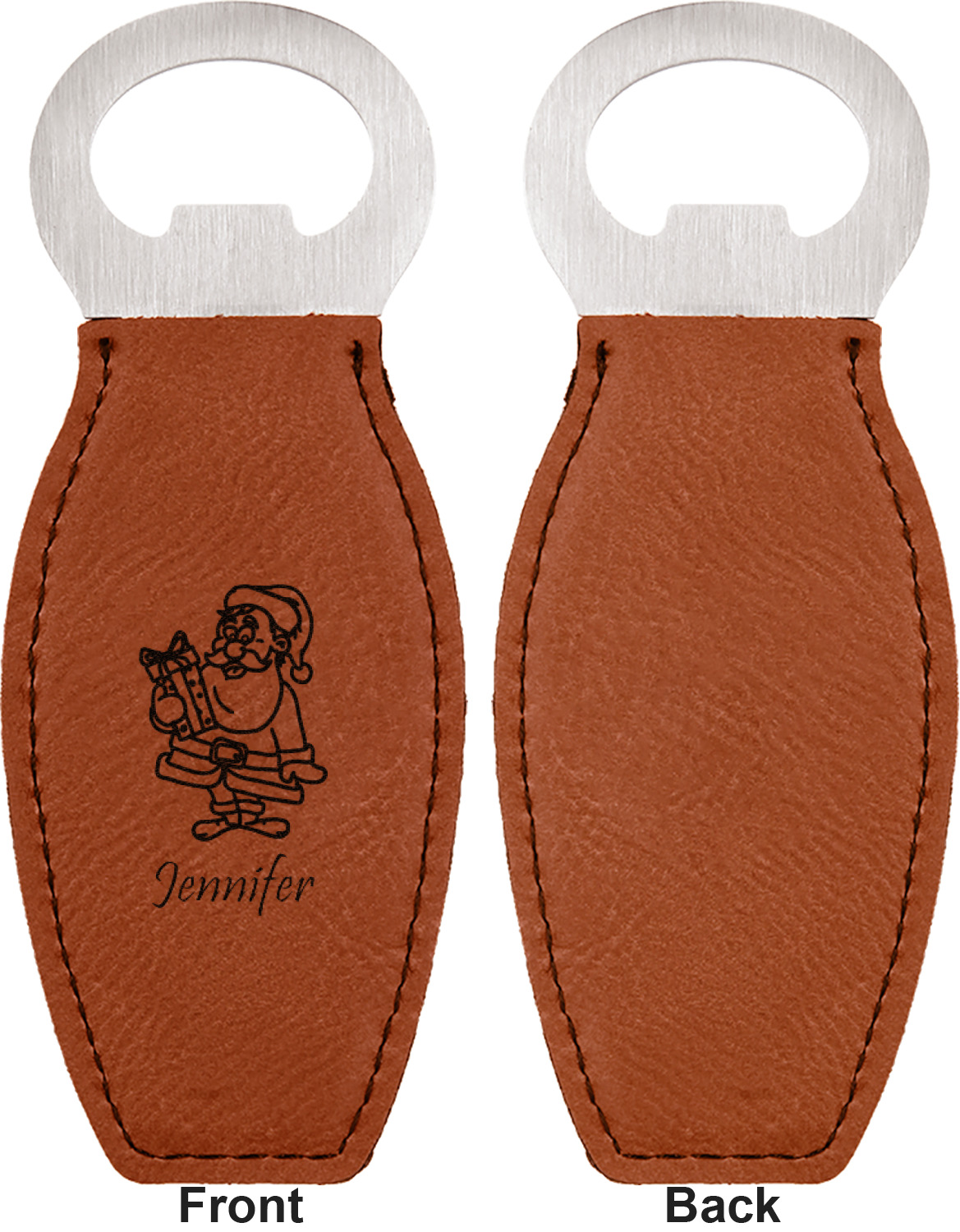 Built from stainless steel, these custom bottle openers are wrapped in a cognac-colored leatherette. Sharp, black stitching lines the edges for extra durability and a finished touch. Your personalization is laser-engraved onto the surface of this leatherette, leaving behind a crisp, black coloration. At 4.6 by 1.8 inches, this beer bottle opener gives you much of leverage when trying to open a stubborn bottle. On the opposite end of the opener, you'll find a magnet that you can use to display your new, unique bottle opener!