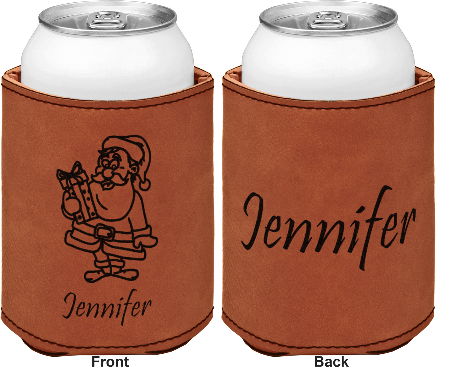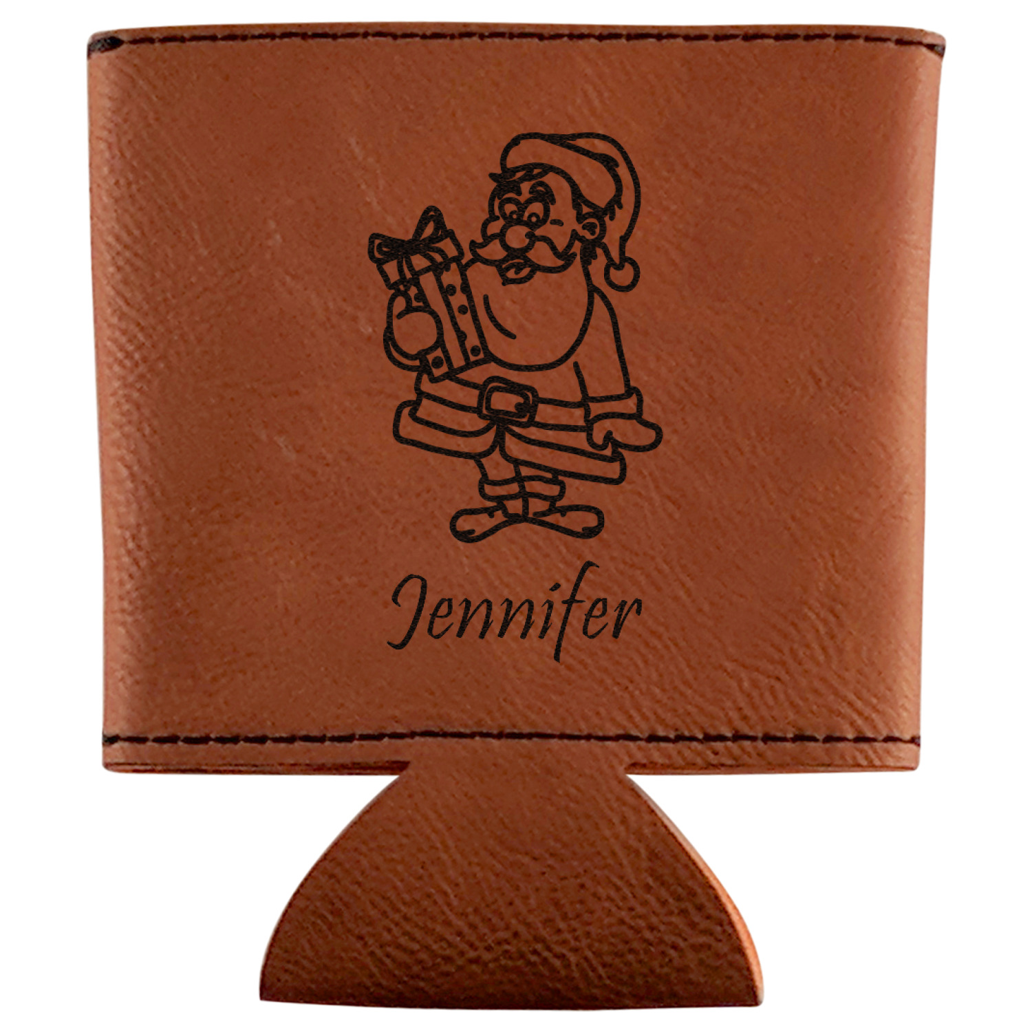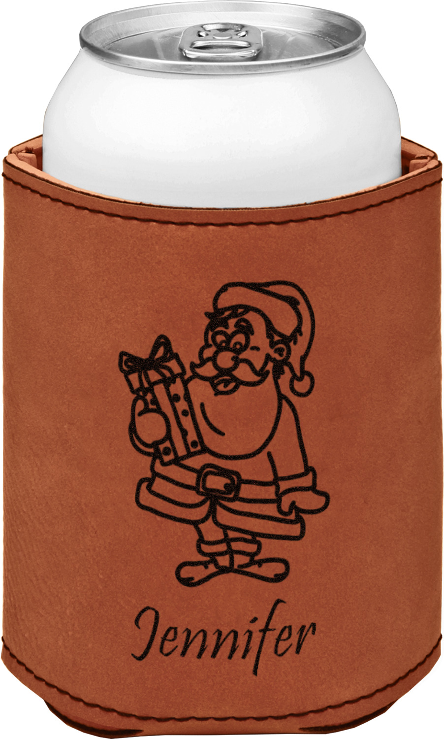 This can sleeve is made from a cognac-brown leatherette and stitched with a sturdy, black thread. A slim padding lines the inside of your can sleeve to allow for a better fit once your drink is inserted. The sleeve itself measures at 4 by 4.5 inches, allowing this custom can sleeve to accommodate most canned drinks. Your personalized design can be engraved on the front and back, or solely the front. When laser-engraved, your design appears as a black coloration which contrasts the leatherette nicely.