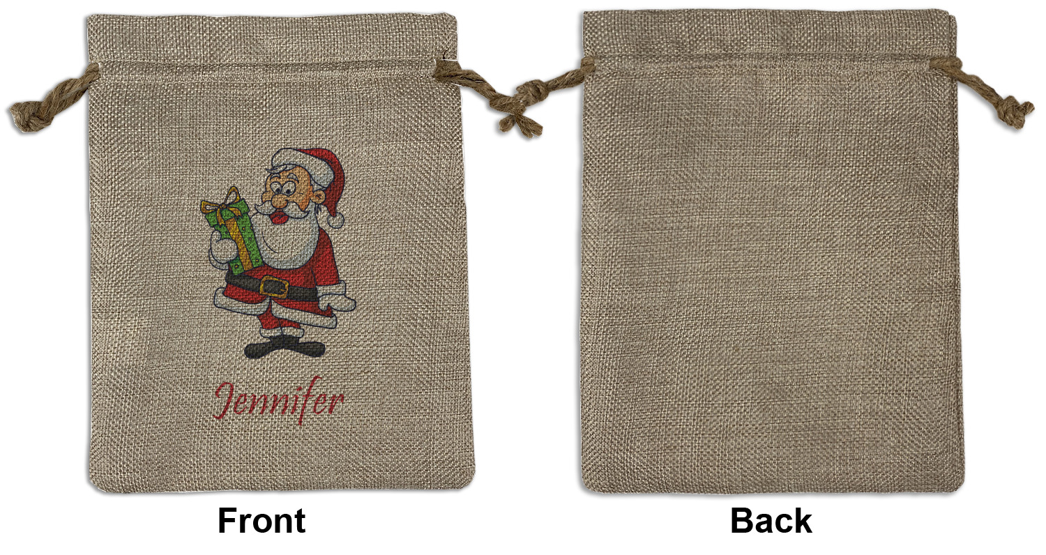 We sell our Burlap Gift Bags in 3 variant sized bags. Made with burlap polyester, each personalized bag can be secured with a twine drawstring pull. Your custom design is available to print on one side or both sides - completely up to you! The sizes of the bags measure approximately 4.5" x 6.5" for the smallest size, 6.5" x 8.0" for the medium size, and 6.5" x 13.5" for the large-sized bag.