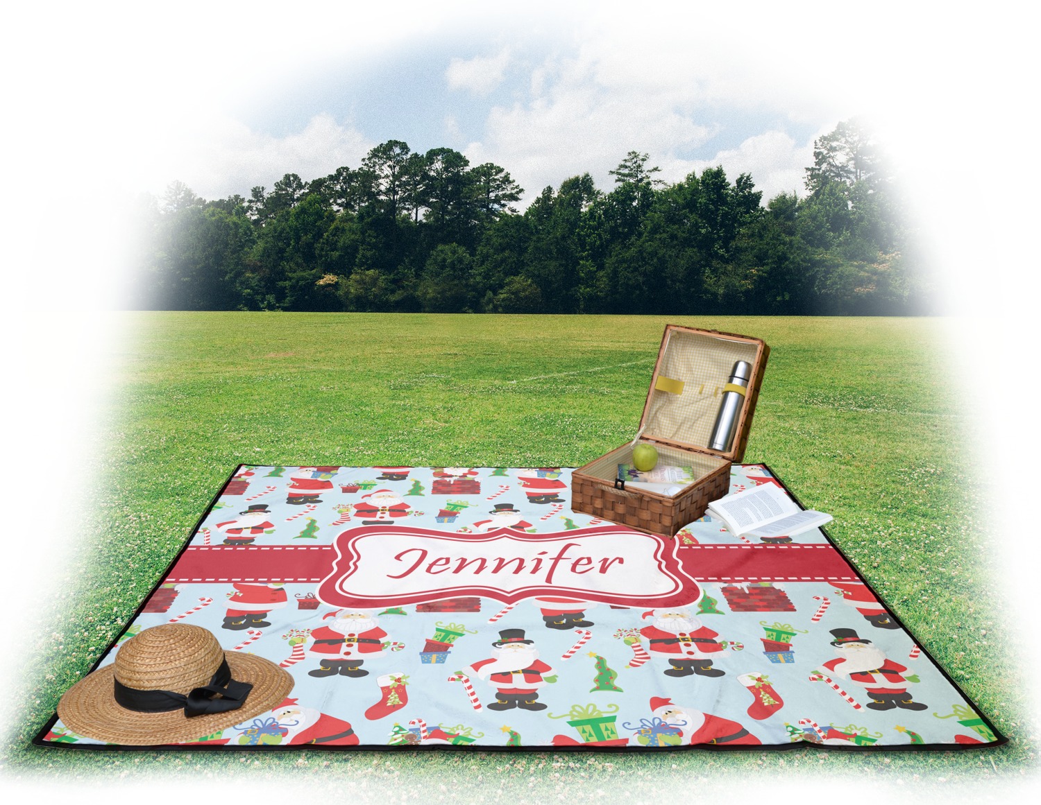 This picnic blanket is perfect for hanging out with your friends at the park or anywhere outside. The top of the blanket is made of a super soft microfiber fleece. The bottom of the blanket is made of a black material similar to a rain jacket and is water repellent as well. This will keep any wet spots on the ground from soaking through your picnic blanket. No one likes a wet blanket. The blanket measures at approximately 50" x 59" and has a nicely finished ribbon edge.