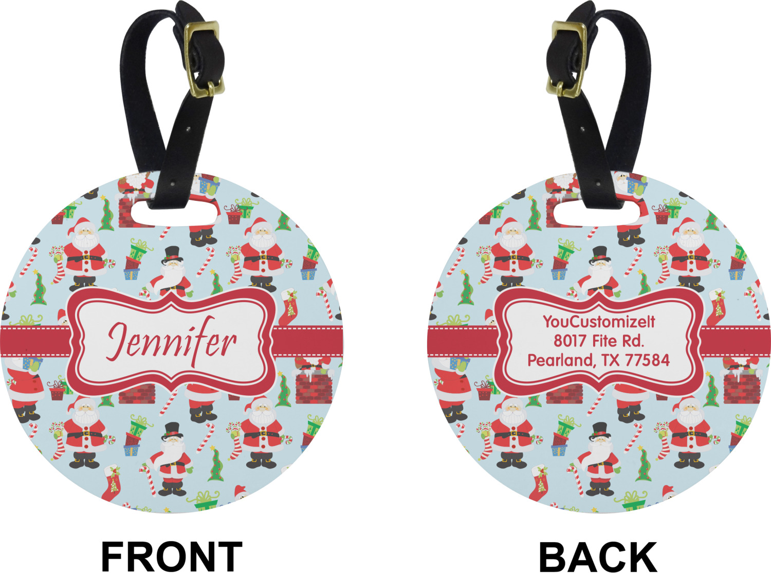 These personalized bag tags are sold in a variety of shapes, so that you may find the product that meets your vision exactly. We sell a round luggage tag, which measures at approximately 4" x 4". Our square luggage tag is about 3.5" x 3.5", while our rectangular version is 2.75" x 4 ".