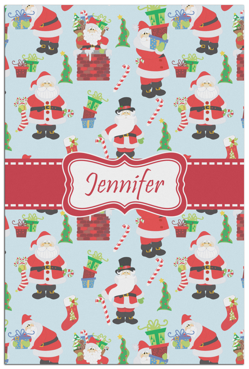 Believe in Santa Claus? Whether you do or not, this design is absolutely adorable with the background that has a cheerful Santa Claus all decked in his red and white, climbing down a chimney to leave presents upon presents and endless candy canes under your Christmas tree. The ribbon and label are red, and the label is the perfect place to put your name or text for personalization.