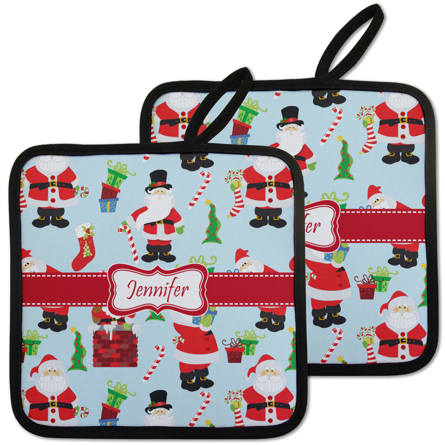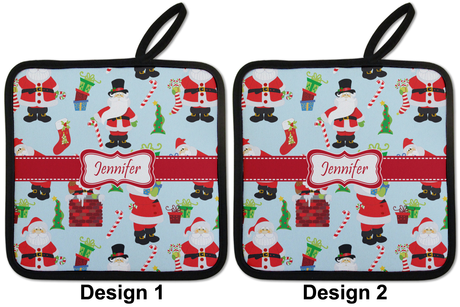 Our personalized pot holders feature a neoprene front that displays your personalization in vibrant colors. The backing of the hot pot holder is rubberized; the textured backing allows you to have a great grip when using this custom pot holder. The two materials are joined with a sleek, black trim, and the holder also includes an attached loop for hanging and storage. The pot holder is approximately 8.75 inches by 8.75 inches and 0.25 inches tall, while the fabric loop is 2.5 inches long. You can purchase a kitchen pot holder by itself or as a set of 2. We also offer a set including one pot holder and one oven mitt.
