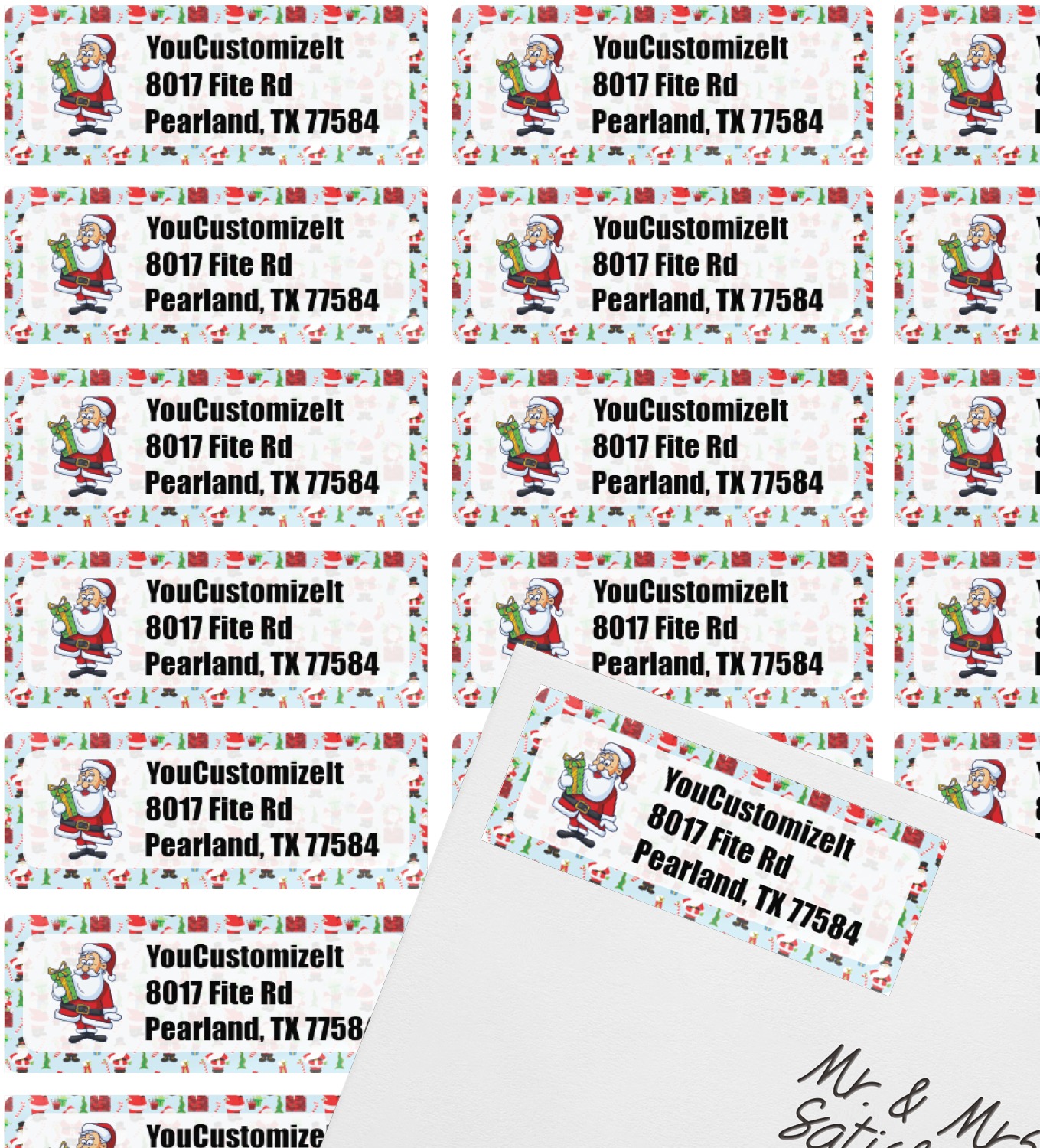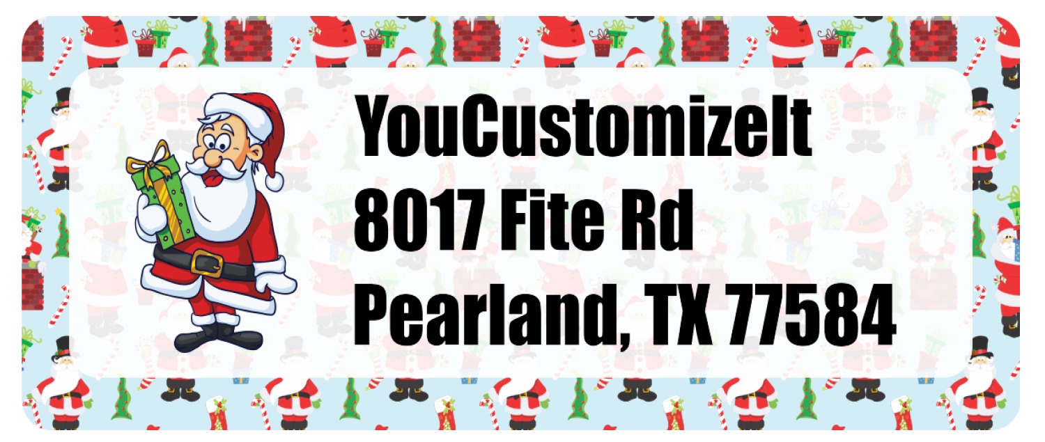 Believe in Santa Claus? Whether you do or not, this design is absolutely adorable with the background that has a cheerful Santa Claus all decked in his red and white, climbing down a chimney to leave presents upon presents and endless candy canes under your Christmas tree. The ribbon and label are red, and the label is the perfect place to put your name or text for personalization.