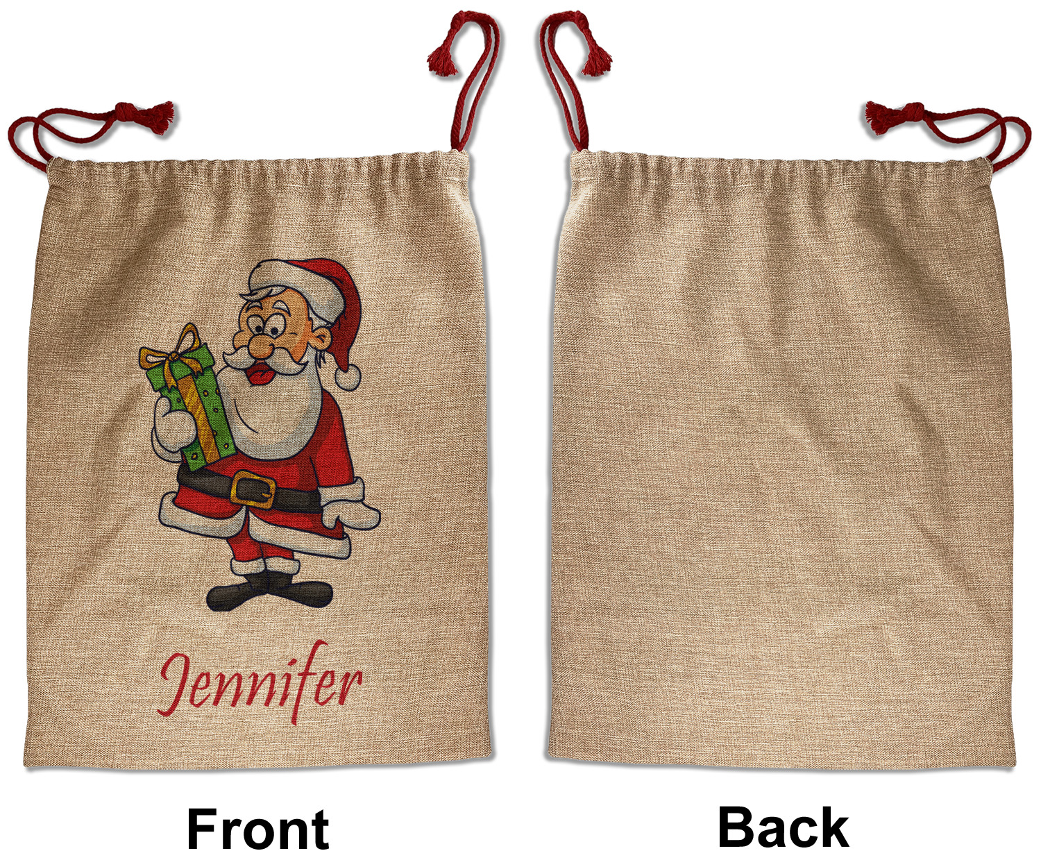 Our Santa sacks print your design on the burlap material giving it a nice rustic, natural design! The burlap material is also machine washable and wrinkle-free, so feel free to fold and store out Santa bags until the next time you need it! Secure your gifts with our red accent drawstring ties at the top of the sack so the mystery of your gift stays a surprise until Christmas day. We offer two types of printing- one side partial print or double-sided partial printing. Design and personalize your own Santa sack in time for the holidays!