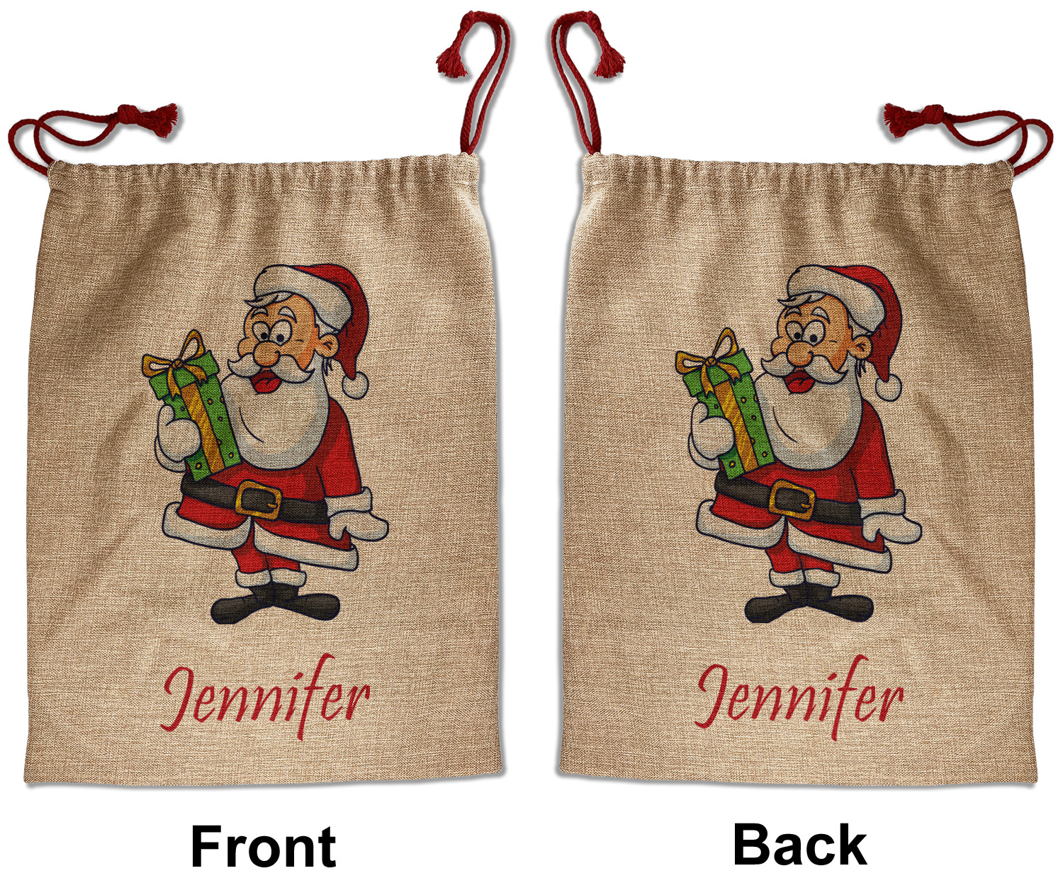 Our Santa sacks print your design on the burlap material giving it a nice rustic, natural design! The burlap material is also machine washable and wrinkle-free, so feel free to fold and store out Santa bags until the next time you need it! Secure your gifts with our red accent drawstring ties at the top of the sack so the mystery of your gift stays a surprise until Christmas day. We offer two types of printing- one side partial print or double-sided partial printing. Design and personalize your own Santa sack in time for the holidays!