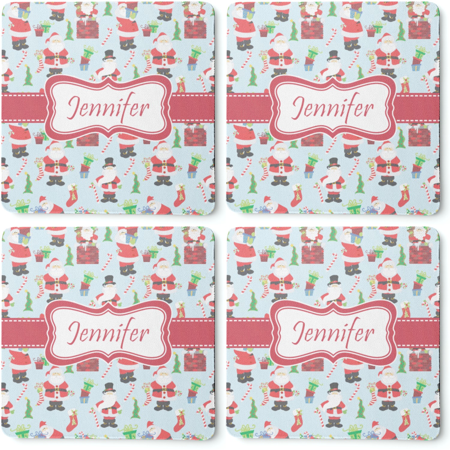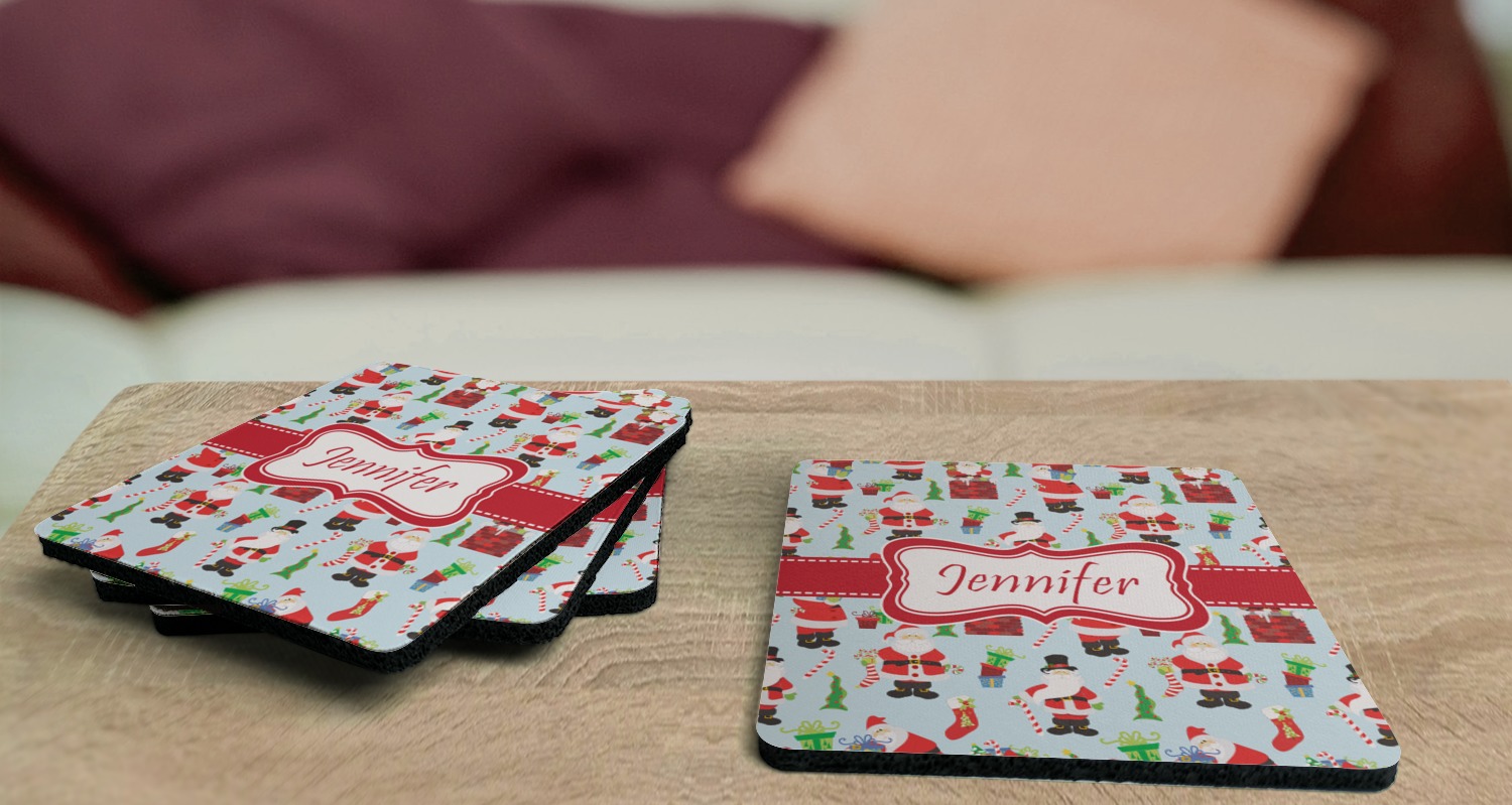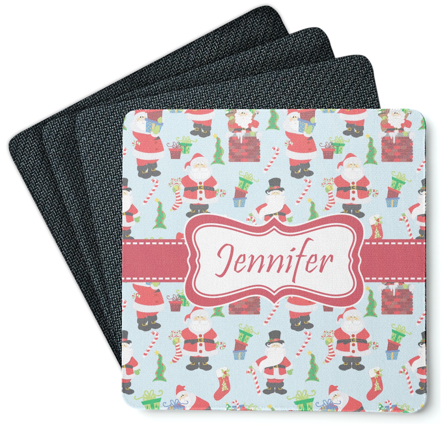 These drink coasters have a smooth, polyester top and a textured, rubber backing on its bottom. The non-slip rubber backing underneath works to keep any spills at bay. At 4 by 4 by 0.25 inches thick, these custom coasters are a suitable size for most drinkware. Your personalization is displayed atop the face of the cup coaster. We sell these rubber coasters in two different shapes: square and round. You can buy each shape as singulars or as a set of 4.