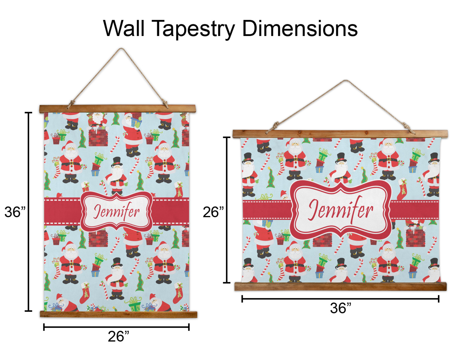 Made in two different orientations - portrait or landscape - both are 26" x 36". Your design is printed on a high quality polyester fabric with hemmed edges. The wood on the top and bottom of the tapestry is 1.25" tall and 0.25" thick and there are two pieces on top and bottom which sandwich the fabric.