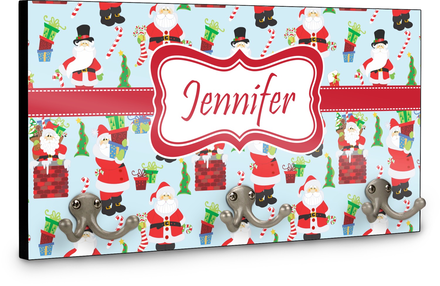 This coat rack is the perfect way to add some personality to your wall or entryway. The board is made of a strong maple that is approximately 16" x 8". The three 2-prong hooks are a sturdy metal that have three screws attaching them to the board. Your design is printed right onto the front of the board while the back and sides are a simple black.