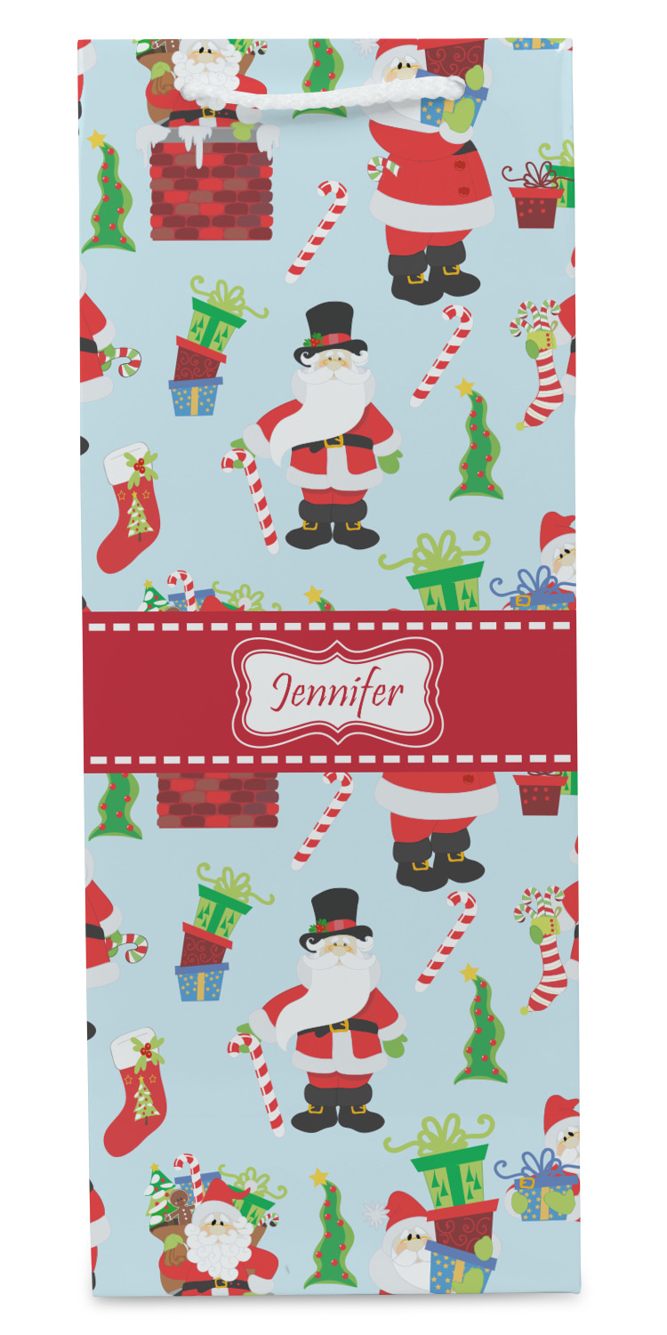 Believe in Santa Claus? Whether you do or not, this design is absolutely adorable with the background that has a cheerful Santa Claus all decked in his red and white, climbing down a chimney to leave presents upon presents and endless candy canes under your Christmas tree. The ribbon and label are red, and the label is the perfect place to put your name or text for personalization.